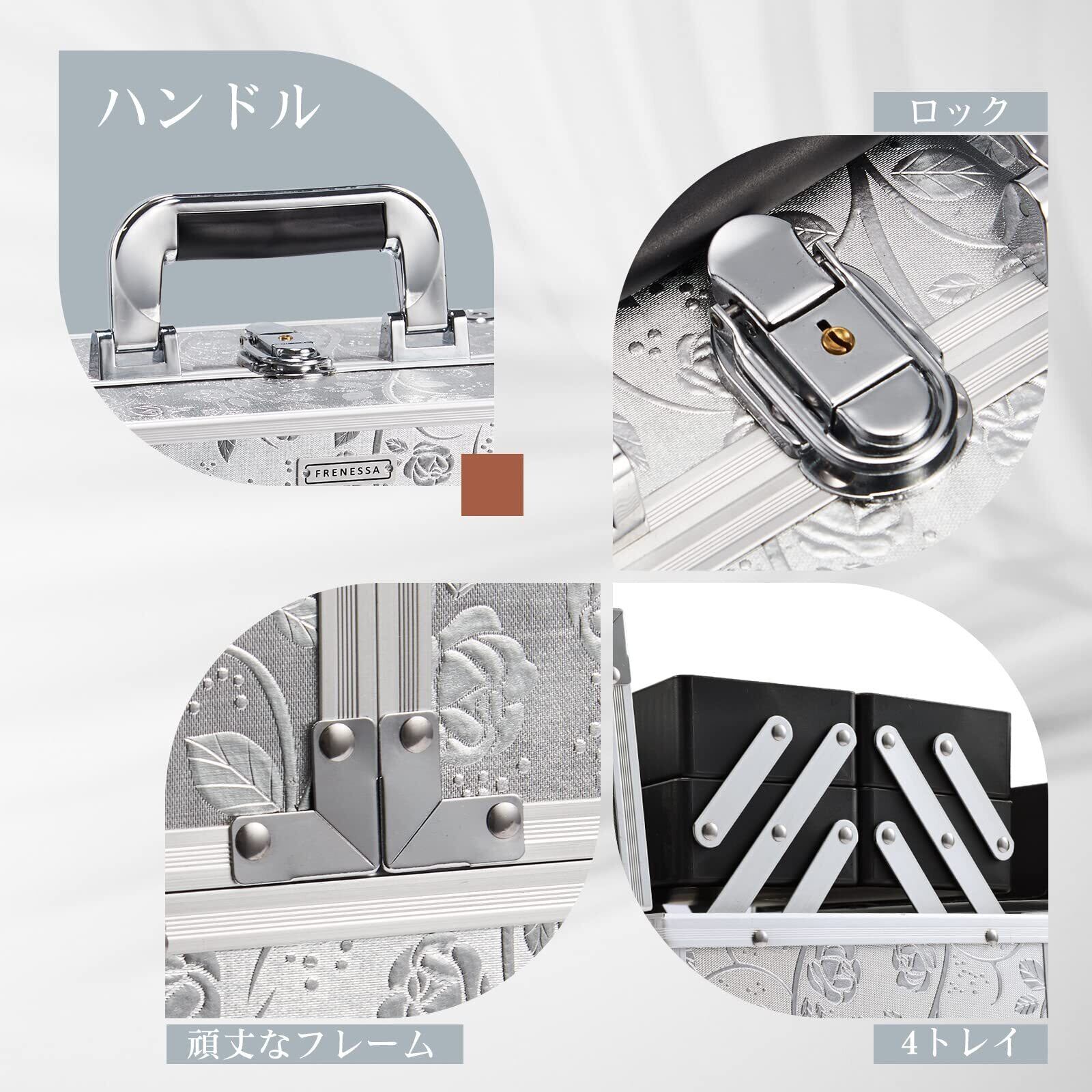 【おしゃれなデザイン】外部にシルバーのバラの花をポイントに使ったメイクボックスはどこでも高級感を演出できます。左右各2段のスライドトレイ、頑丈で汚れにくいメイクボックスです。サイズ:25*18*23.5cm 素材:植物繊維木材と表面PVC 裏地:绵フランネル フレーム:アルミ合金