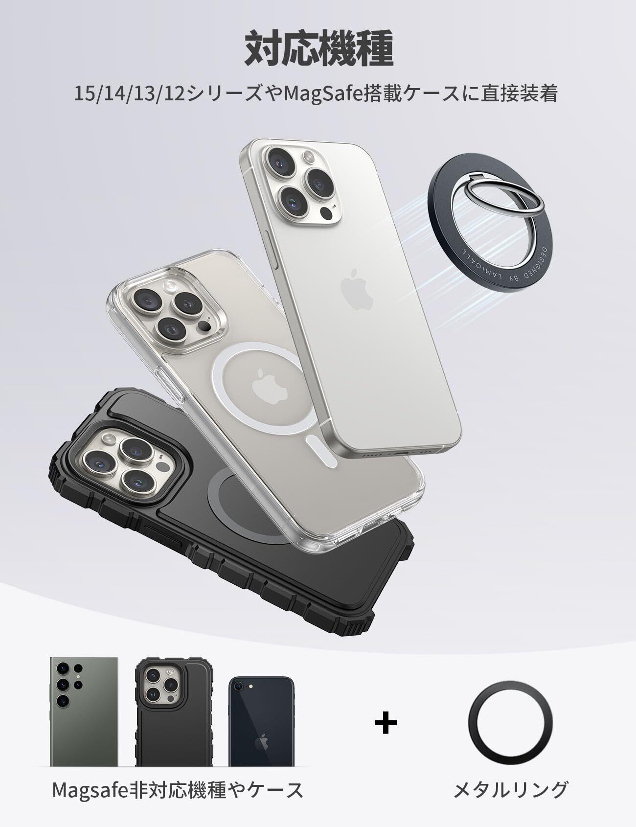 【対応機種】iPhone 2024, iPhone 16 16Plus 16Pro 16Pro Max, iPhone 15 15Plus 15Pro 15Pro Max, iPhone 14, 14pro, 14pro max, 14Plus, iPhone 13, 13 Pro, 13 Pro Max, 13 mini, iphone 12, 12 Pro, 12 Pro Max, 12 miniの本体やMagSafe搭載ケースに直接装着可能です。付属されたメタルリングを利用すると、磁力がもっと強くなります。