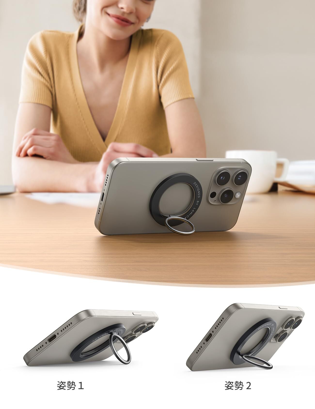 【ご注意】回転部をスムーズに回転できますために、持つ時にゆるゆるの感じがあります。画像6のような二つの姿勢で置けば、卓上スタンド機能に影響しません。また、メタルリングをしっかり貼り付けることを確保するために、24時間後ご使用ください。また、メタルリングを利用する場合は、磁力が強くなります。正面から引き抜くとメタルリングも取り外す恐れがありますので、横から抜いてください。