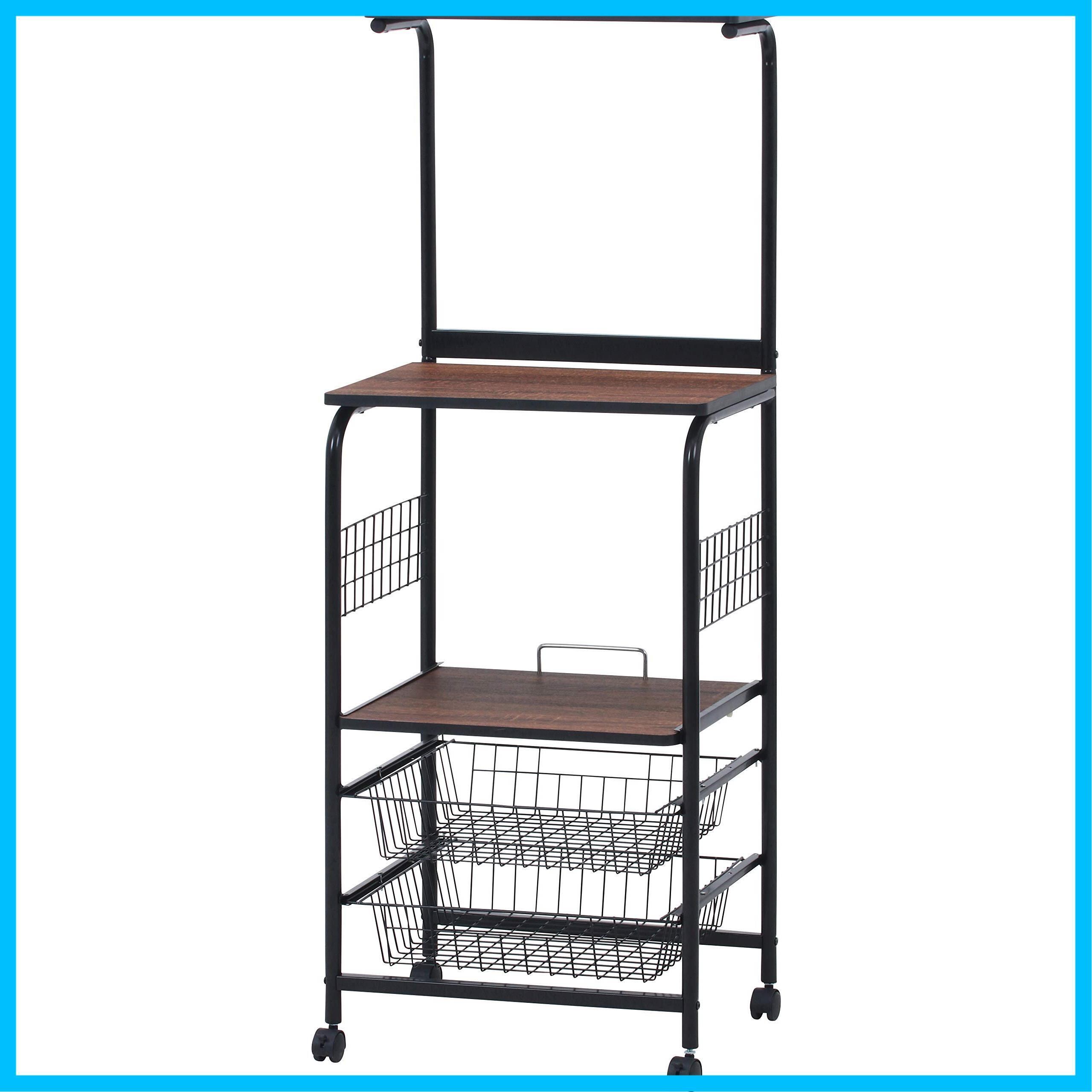 不二貿易 レンジ台 キッチンラック 幅51.5×奥行41×高さ140.5cm ブラック ブラウン スライド棚 収納 レンジワゴン キャスター付き 14637