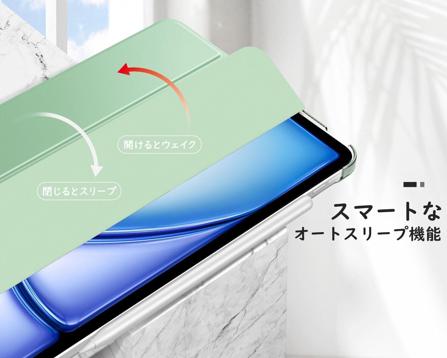 MoKo iPad Air 11インチ ケース(2024) / iPad Air5/4 10.9インチ ケース 11インチiPad Air(M2) iPad Air第5/4世代 10.9 カバー 半透明 オートスリープ ApplePencilPro/第2世代ペアリング&充電対応 三折りスタンド PUレザー 裏地マイクロファイバー スマートケース グリーン