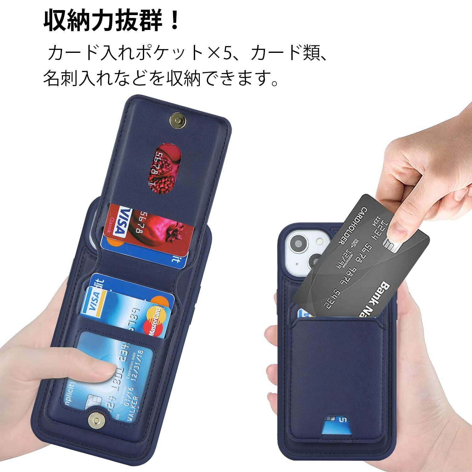 【リムーバブルカードケース】◀ケース背面には取り外し可能な磁気吸引カードケースが付属し、カードを5枚収納できる。たとえば、スイカカードなどの毎日の重要なカードや現金は簡単に保管できます。iPhoneシリーズ専用に設計されているので、ケースを装着したまま、音量ブボタン、カメラ、コネクターなどのを自由に使えます。実用性が高いです。◀横置きスタンド機能:取り外し可能なカードスロットは、横画面でも縦画面でも簡単に実現できる携帯電話スタンドに簡単に変換できます。映画を見たり読んだりすることで手を解放できます。