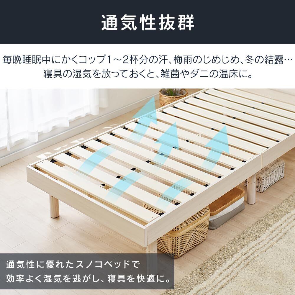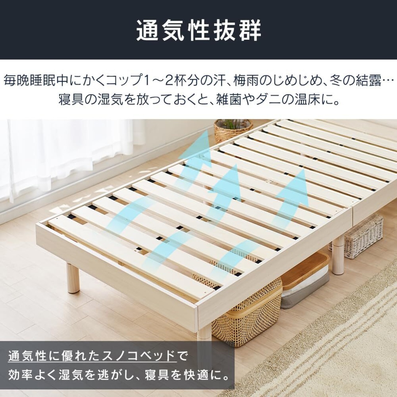 高さ3段階、サイド収納も備えた棚、2口コンセント付きのがっちりスノコベッドです。