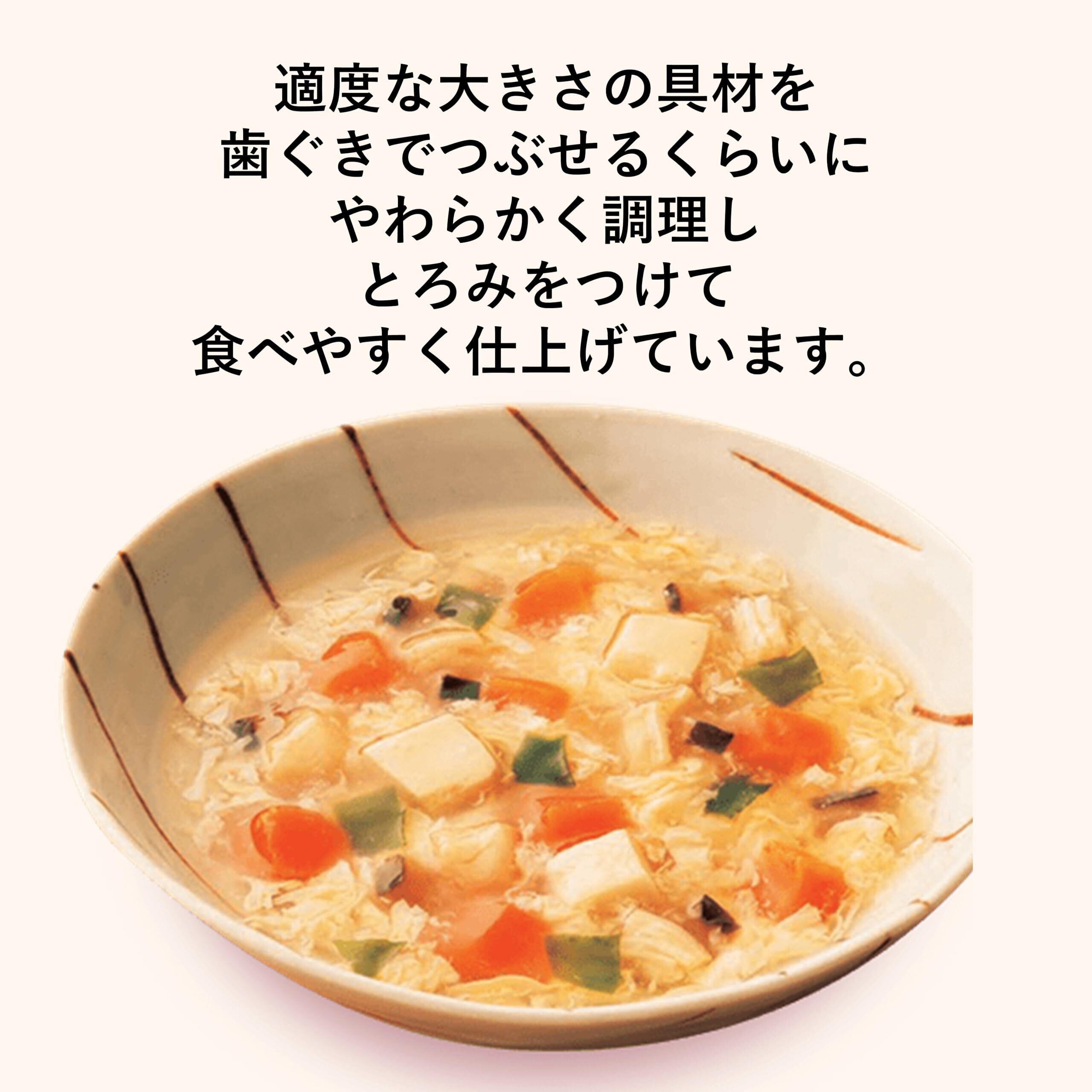 【貝柱の彩りかきたま】いたや貝柱(中国)、にんじん、鶏卵、豆腐、しいたけ、かつお節エキス、こんぶエキス、食塩、ほたてエキスパウダー、乾燥わかめ/増粘剤(加工でん粉、キサンタンガム)、卵殻カルシウム、調味料(アミノ酸等)、豆腐用凝固剤、(一部に卵・乳成分・大豆を含む)