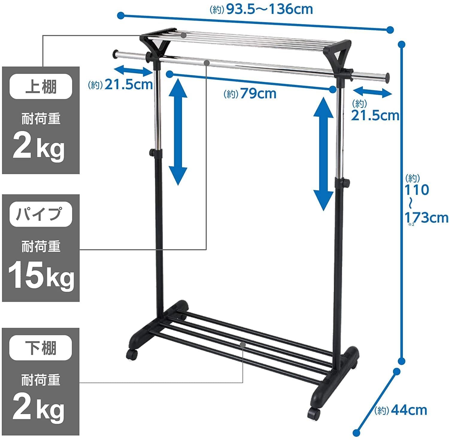 ドウシシャ ハンガーラック 掛ける・置ける 上下棚付き 縦横伸縮 パイプハンガー 全体耐荷重22kg 頑丈 キャスター付き シングル 黒 大容量 おしゃれ 洋服収納ラック パイプハンガー 服掛け 衣類 押入れ 室内干し MUH-90BK | グランメゾンショップ