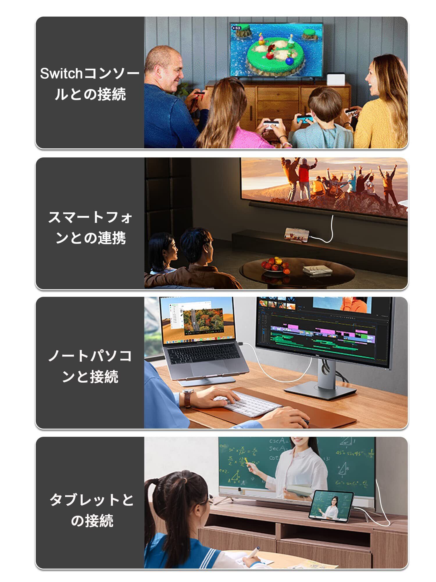 【Switch ドック不要】Switch用のドックを使用しないで、本製品のケーブルを接続するだけで簡単にテレビやディスプレイへの映像出力が可能です。旅行先や外出先で、Switchに接続するだけで大画面でゲームを楽しむことができます。ご注意:Nintendo Switch/Switch OLEDに対応しておりますが、Nintendo Switch Liteとの互換性はありません。Youtubeはサポートされていない