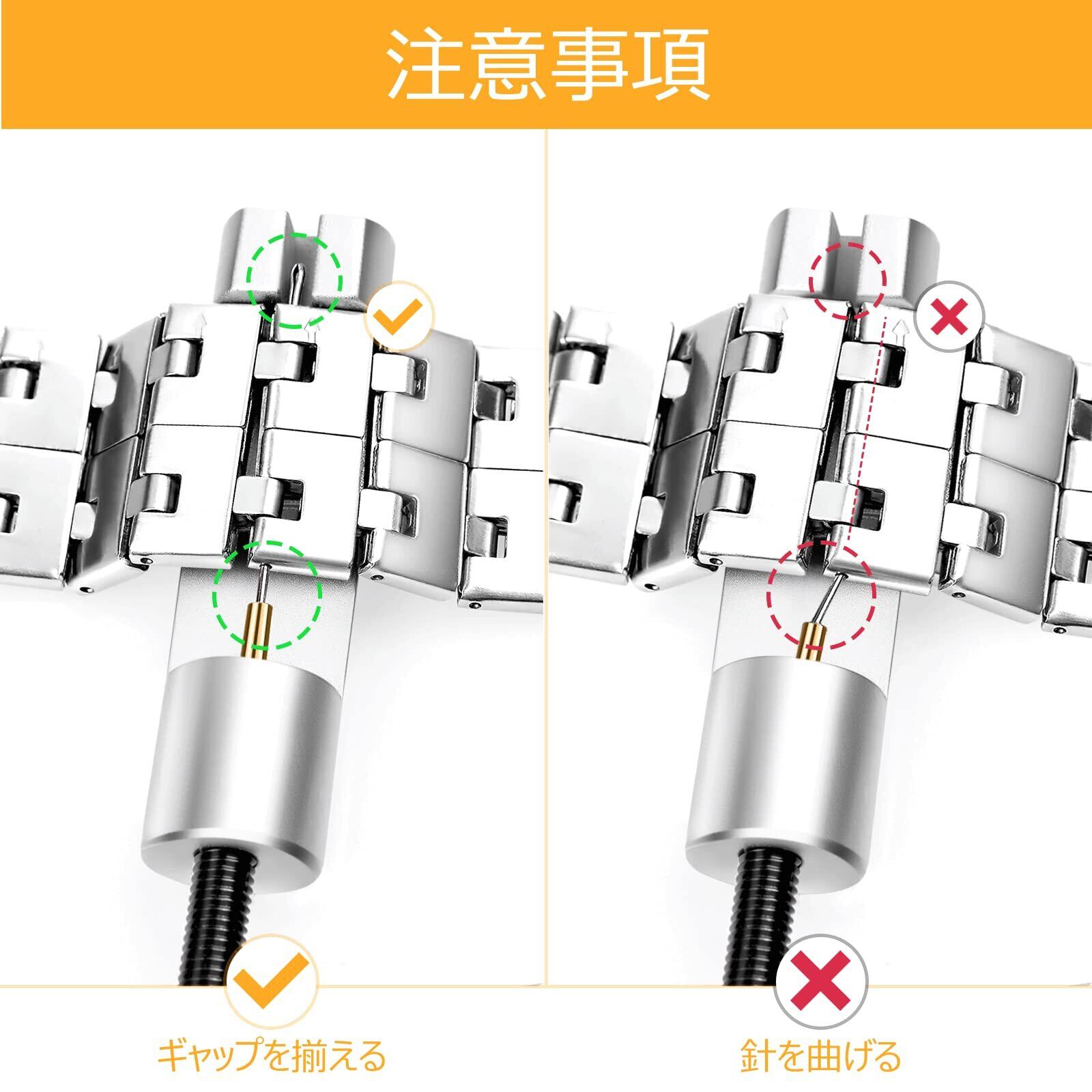 【注】-- 金属ストリップリムーバーを使用してピンを引き抜かない場合は、次の条件が発生するかどうかを確認してください。 1. 刺し針の方向がベルトの矢印の方向と異なります。 2. 金属ベルトプーラーの前面にあるベルトピンホールがギャップと一致していません。 ベルトを調整してください。 調整しないと、プーラーの針先が曲がり、時計が破損しやすくなります。