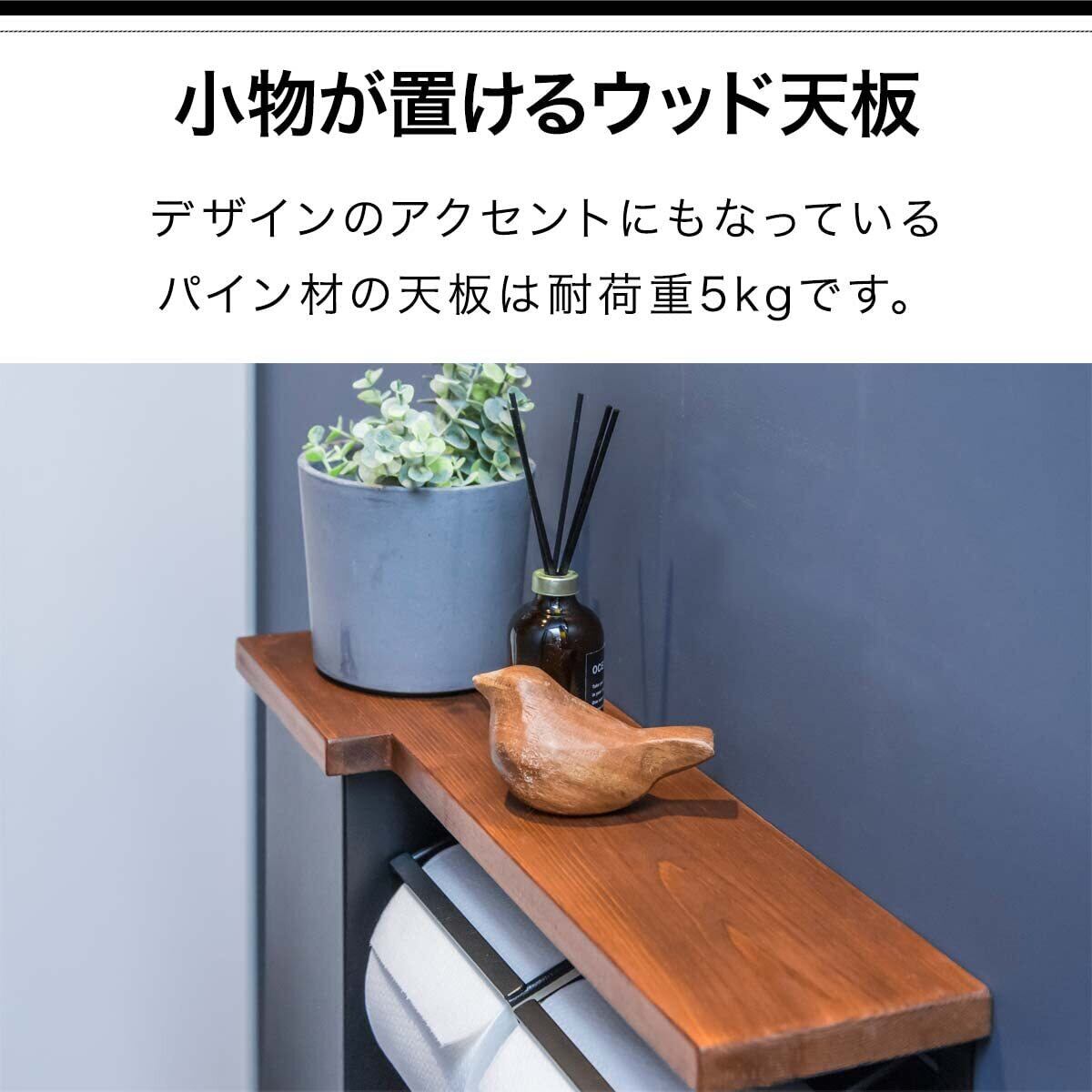 【トイレがオシャレ空間に早変わり!ストッカー付きペーパーホルダー】 パイン材とスチールの組み合わせがおしゃれなサイドシェルフ付きトイレットペーパーホルダー。取り付けるだけでトイレがおしゃれ空間に早変わりするアイテムです。 【アレンジが楽しめる 小物が置けるウッド天板】 デザインのアクセントにもなっているパイン材の天板は耐荷重5kgです。お気に入りの小物やアロマディフューザーを置いてアレンジも楽しめます。