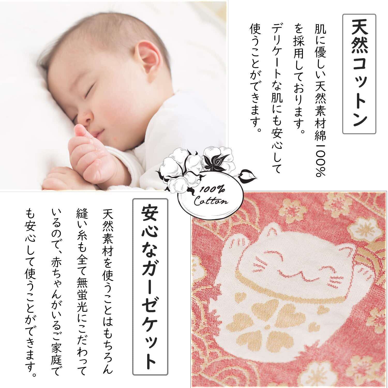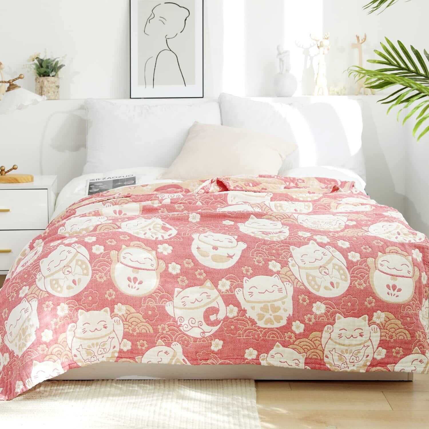 Vanxing ガーゼケット タオルケット シングル セミダブル 綿100% 4重ガーゼ 綿毛布 肌掛け お昼寝 やわらか 吸湿通気 夏快適 洗える150x200cm (招き猫・レッド) | グランメゾンショップ