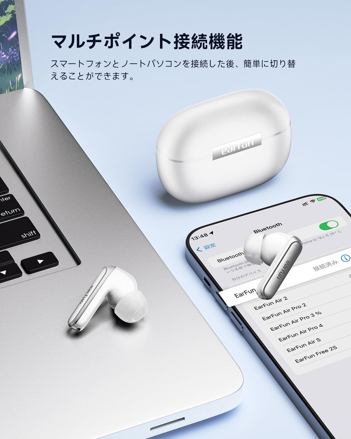 【VGP 2024金賞】EarFun Air 2 Bluetooth 5.3 ワイヤレスイヤホンハイレゾ LDAC対応/40時間再生/マルチポイント接続/10バンド専用アプリ/55msゲームモード/ワイヤレス充電/ IPX7防水【4マイク通話テクノロジー / PSE認証済み】 ハンズフリー通話 音声アシスト機能 (ホワイト)