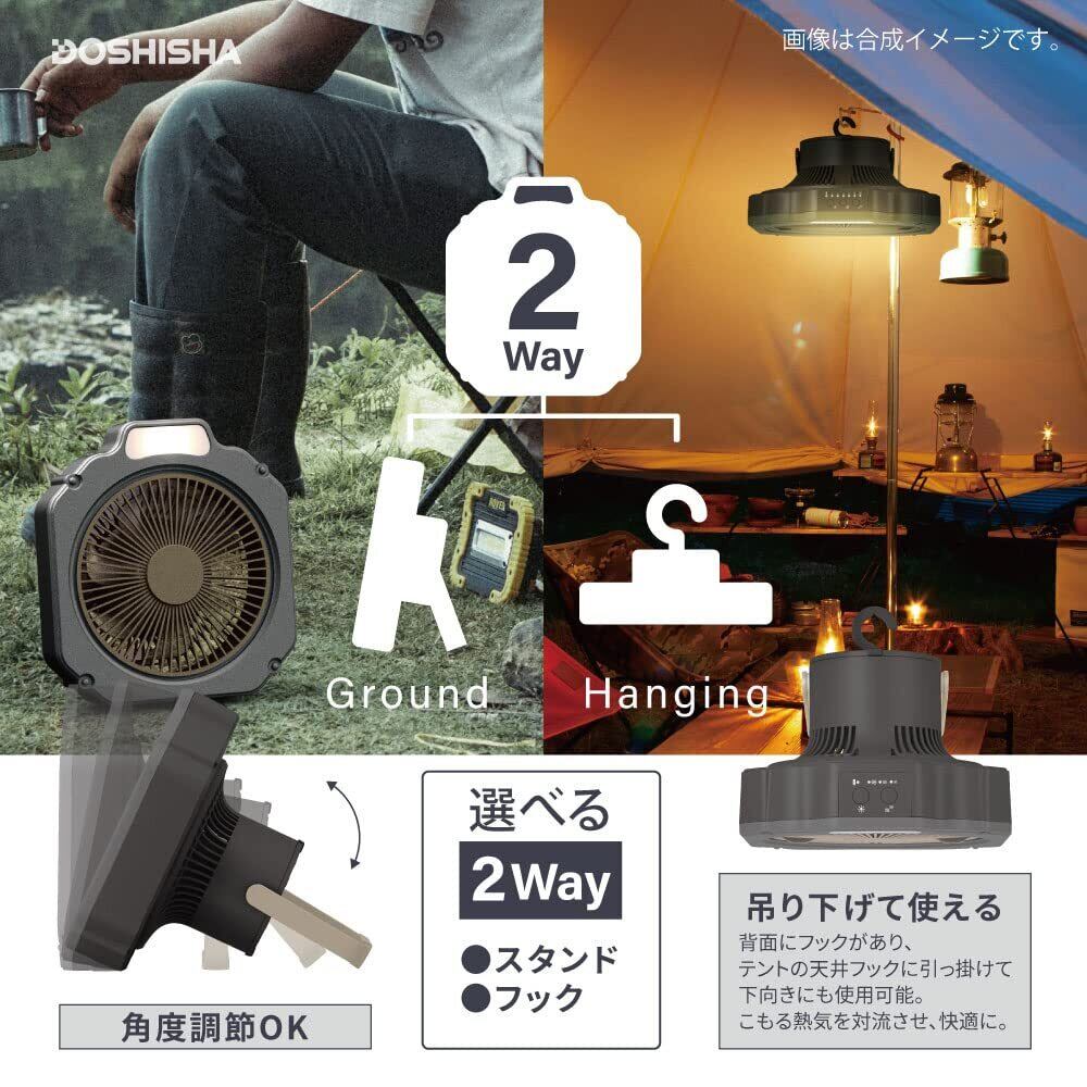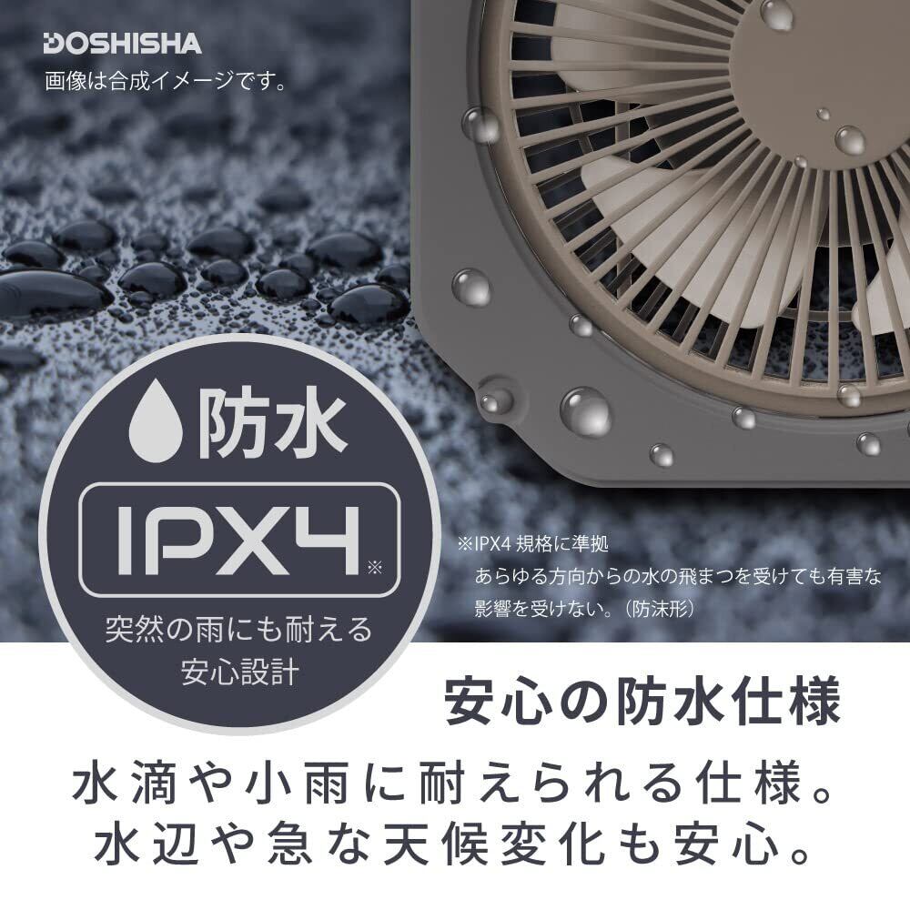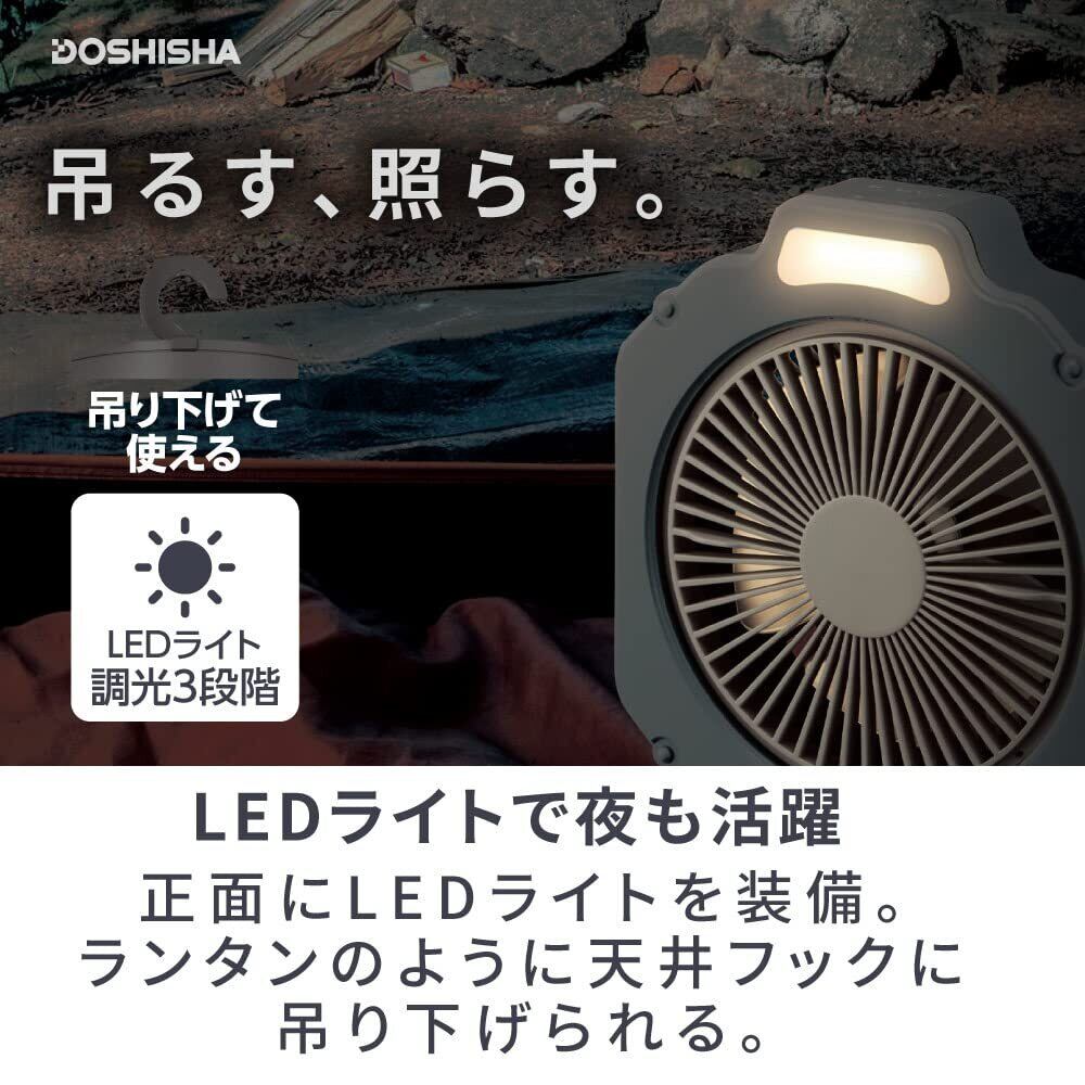 【アウトドアに最適】 ドウシシャ WindGEAR 扇風機 アウトドア向け 14㎝ LEDライト付 防水機能(IPX4) 2電源対応(充電式・USB電源) 風量3段階 収納袋付 ブラック