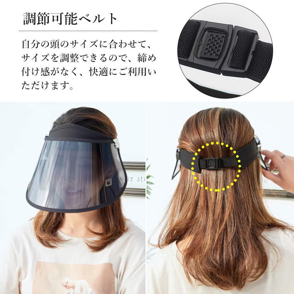 バイザー角度階段調整付き!360°回転つば、強風でもつばの角度をしっかりキープ!つば広調整可なので、日差しにあわせてつばの角度を片手で上げ下げ出来ます!。つば広タイプで顔全体を覆い、耳までもしっかり守ってくれる。風通しがよくて、蒸れない為、化粧崩れなどの心配は要らないです!