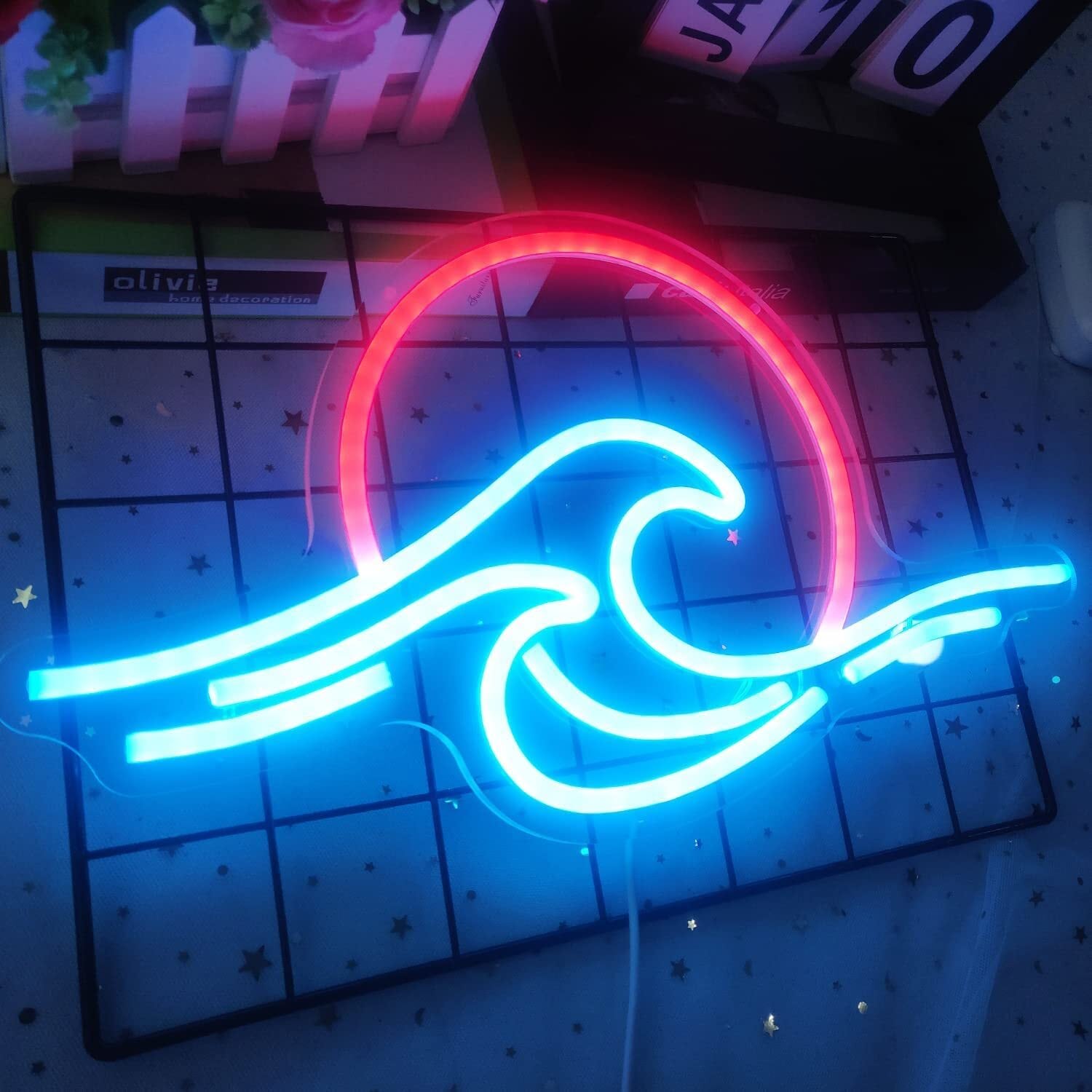 【独特のデザイン】:日の出の日没ネオンサインは、当社の独立したイノベーション製品です。デザインは自然の日の出と波に触発されています。面白い自然なデザインはあなたの友人がそれに魅了されることをします。波のネオンサインは暖かいアイスブルーと赤の光を放ち、退屈な電気スタンドを置き換えて子供部屋に色を加える素晴らしいネオンウェーブサインの装飾です。