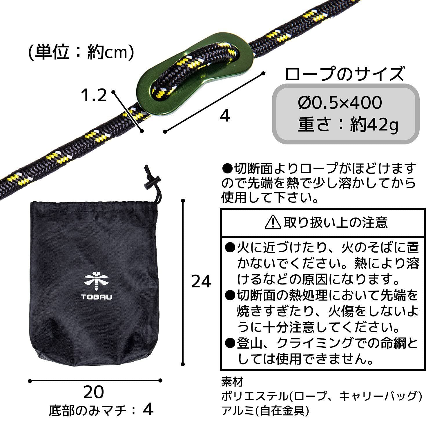 TOBAU オニヤンマロープ セット 5mm × 4m 6本 反射材入り 自在金具 テントロープ タープロープ ガイロープ パラコード キャンプ アウトドア (1set)
