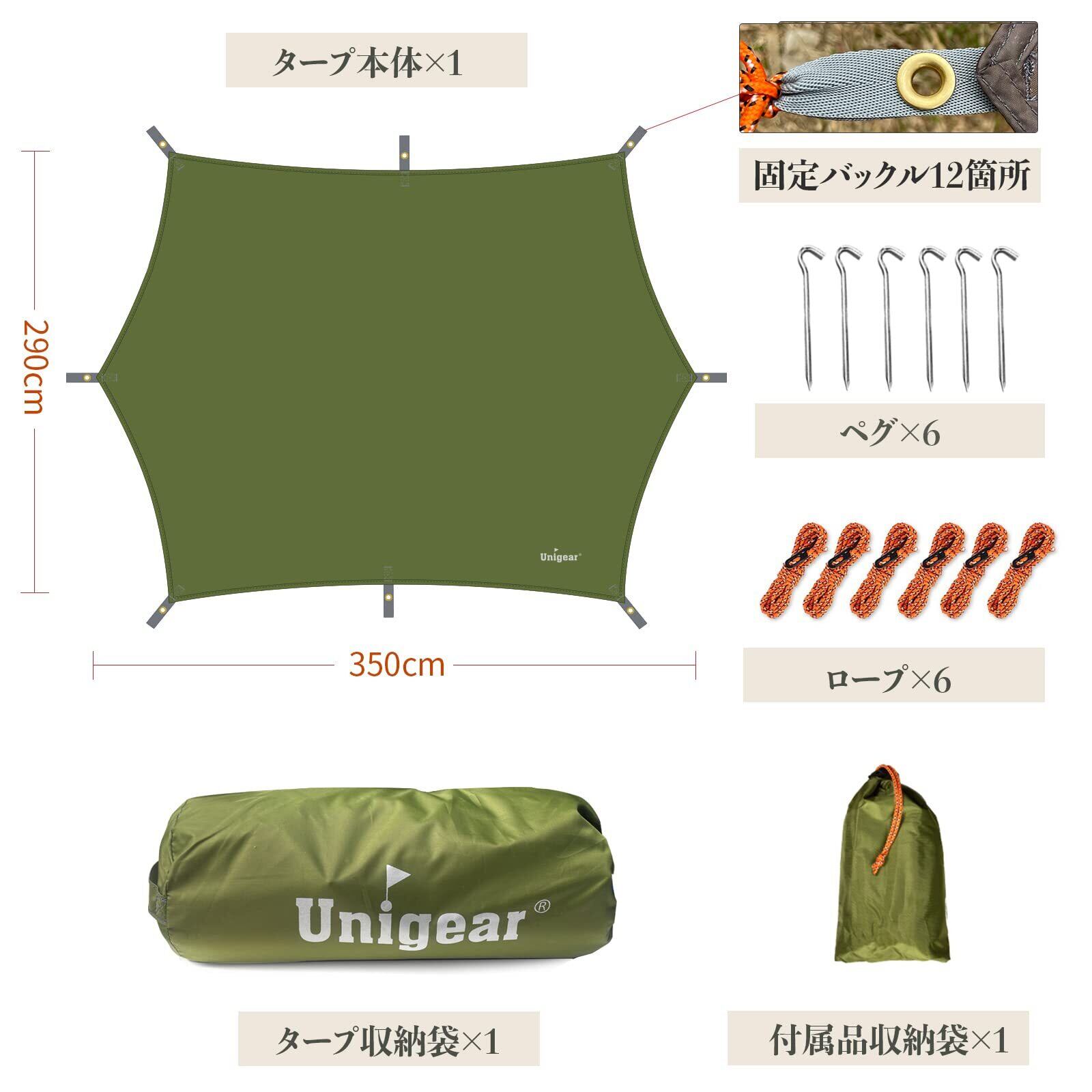 撥水加工とUVカット:Unigear キャンプ タープの素材はPU加工処理済で、耐水圧が3000mmとなり、大雨に強い。また、縫い目にはシームテープが貼られており、雨漏り防止;裏側には紫外線をカットするシルバーコーティングをが施され、暑い季節でも快適に過ごせます。