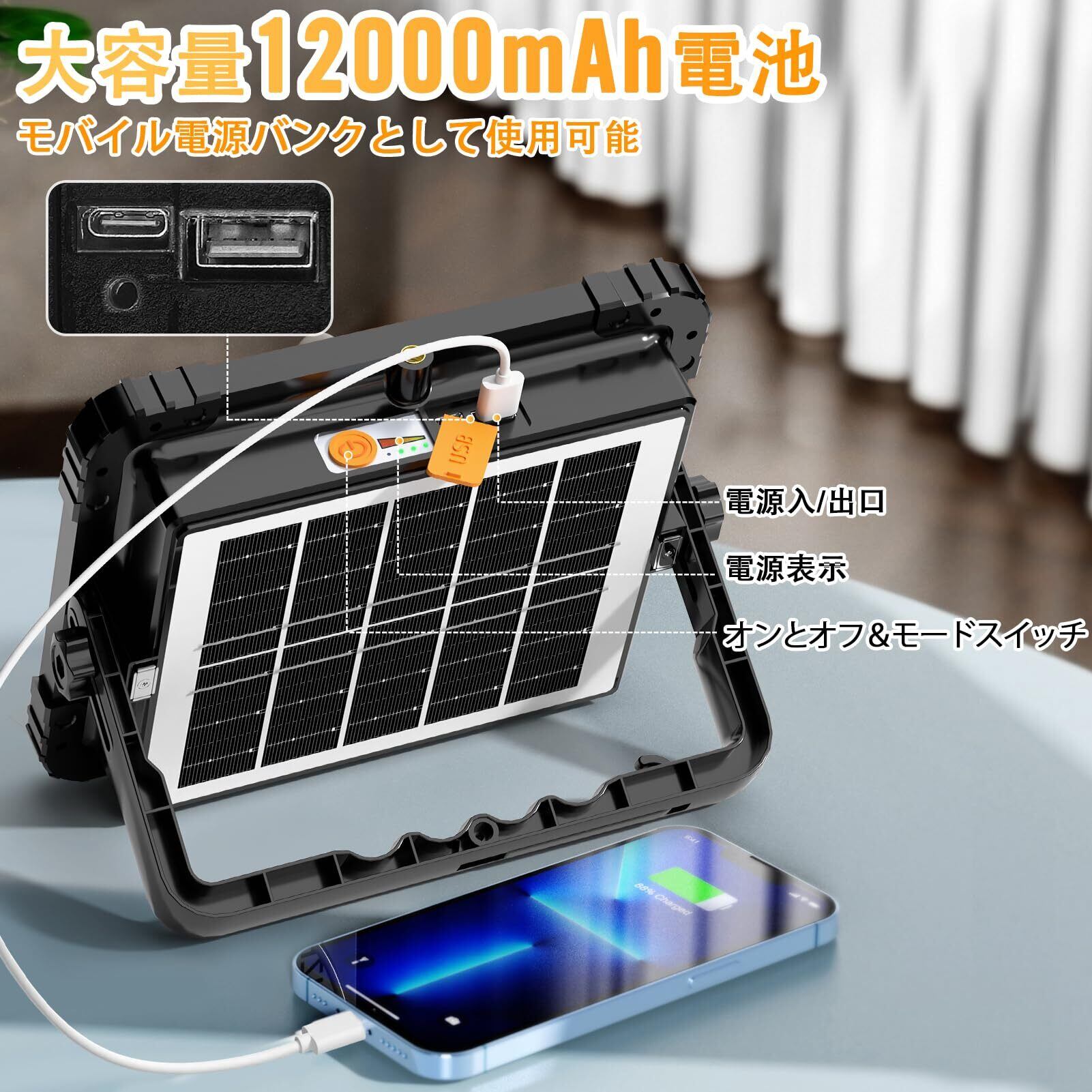 【12000mah大容量充電式投光器】充電式led投光器は12000mah大容量電池内蔵されます、りコンパクト、軽いです。充電機能付き、従来品2倍の充電効率で、充電時間を半分に短縮します。またバッテリ残量ランプが搭載されます。バッテリー残量と蓄電状況が分かりやすくなります。7-15時間稼働できます。