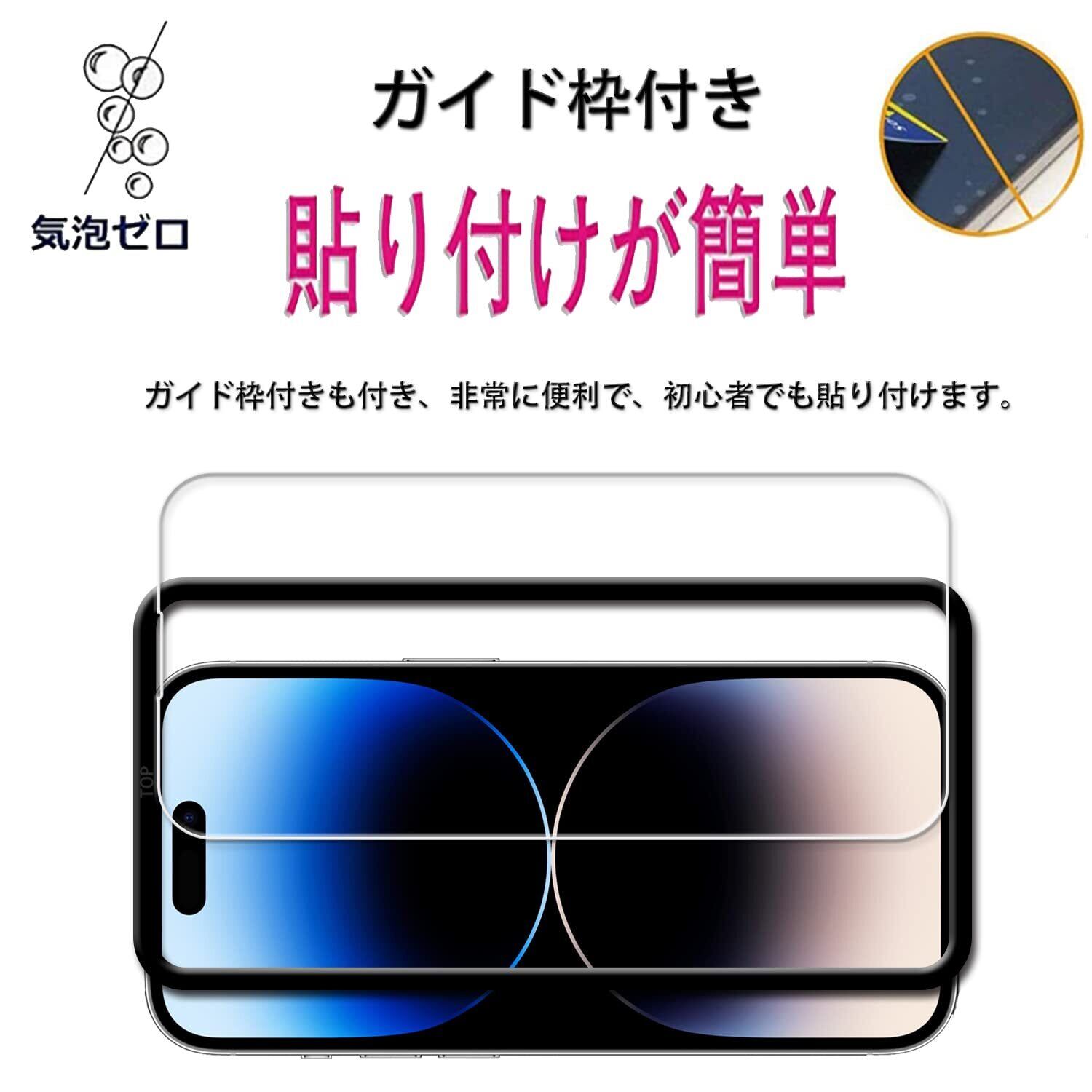 【対応機種】iphone 14 pro ガラスフィルム 2枚 + カメラフィルム2枚 + ガイド枠付き1枚。【注意】この電話の画面の端は湾曲しているため、保護フィルムのサイズが丁度良い場合、しっかりと貼り付けられず、白いエッジやシェルとの干渉などの問題があるため、保護フィルムは画面よりも小さいです。