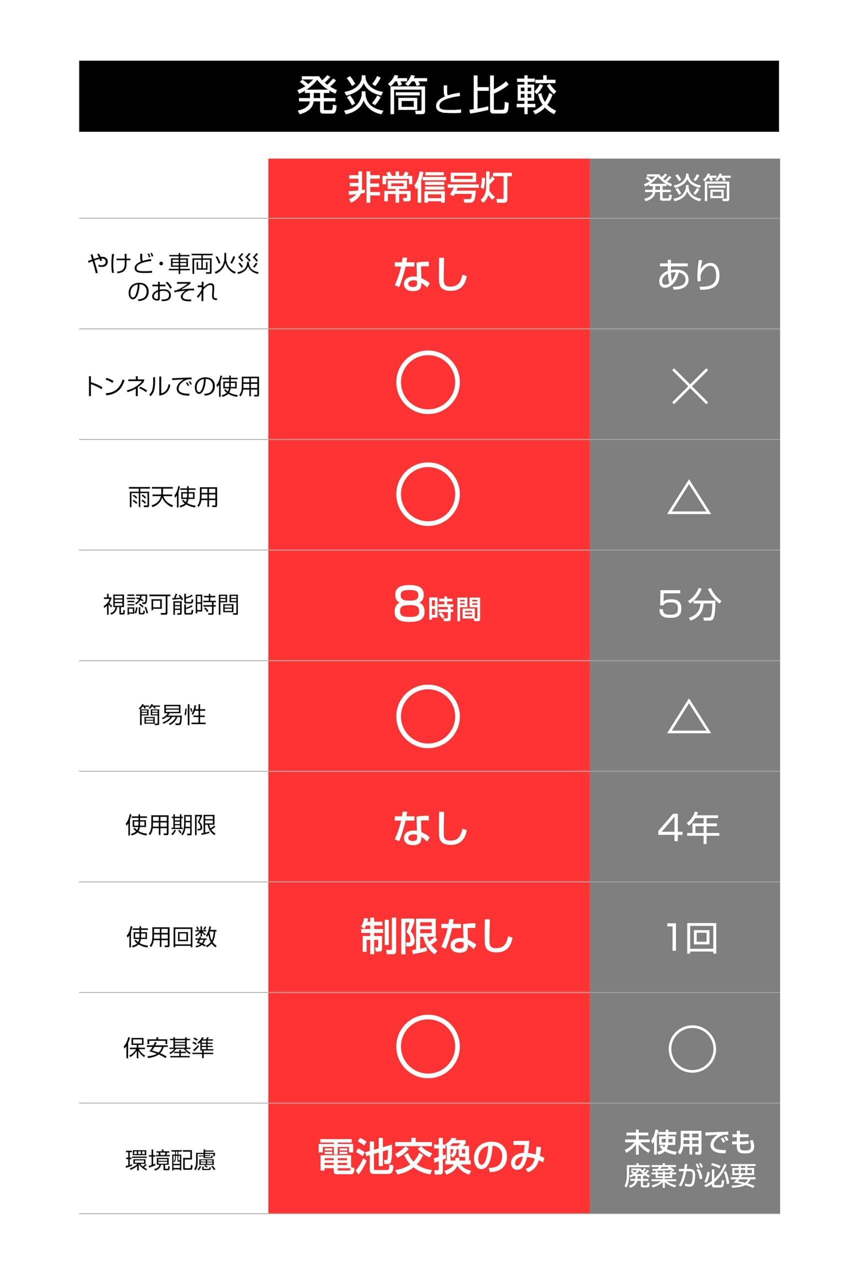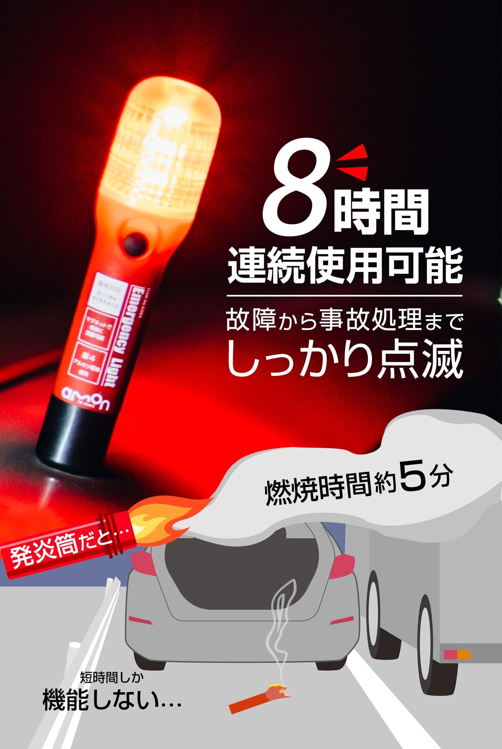 緊急停車時の二次的事故防止に。発炎筒の代わりに車載できる車検対応品。消費期限がなく、電池交換で繰り返し使える。夜間、約200m先からでも確認できる強力発光。連続使用約8時間(新品アルカリ電池を使用した場合)。緊急時でも直感的に操作しやすいスイッチ形状。マグネット付きで車内からでも設置できる。