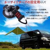 固定する場所が無い時に:カーサイドタープや、テント、サンシェードなど、固定する場所が無い時に必須のアイテム! 軽量でコンパクトなので持ち運びにも便利! どこでも手軽に取り付けが可能で、キャンプを始めとして、ドライブ、車中泊、様々な場面で活躍します。 アウトドアに限らず自宅やオフィス、作業場など、活用の幅の広い便利なアイテムです。 固定可能な場所も多彩、吸盤より大きいタイル、ステンレスなどの金属面、車体、鏡、ガラス、プラスチック、冷蔵庫や洗濯機など、吸盤の気密性を確保できる素材で平らな表面であれば全て取り付け可能です。