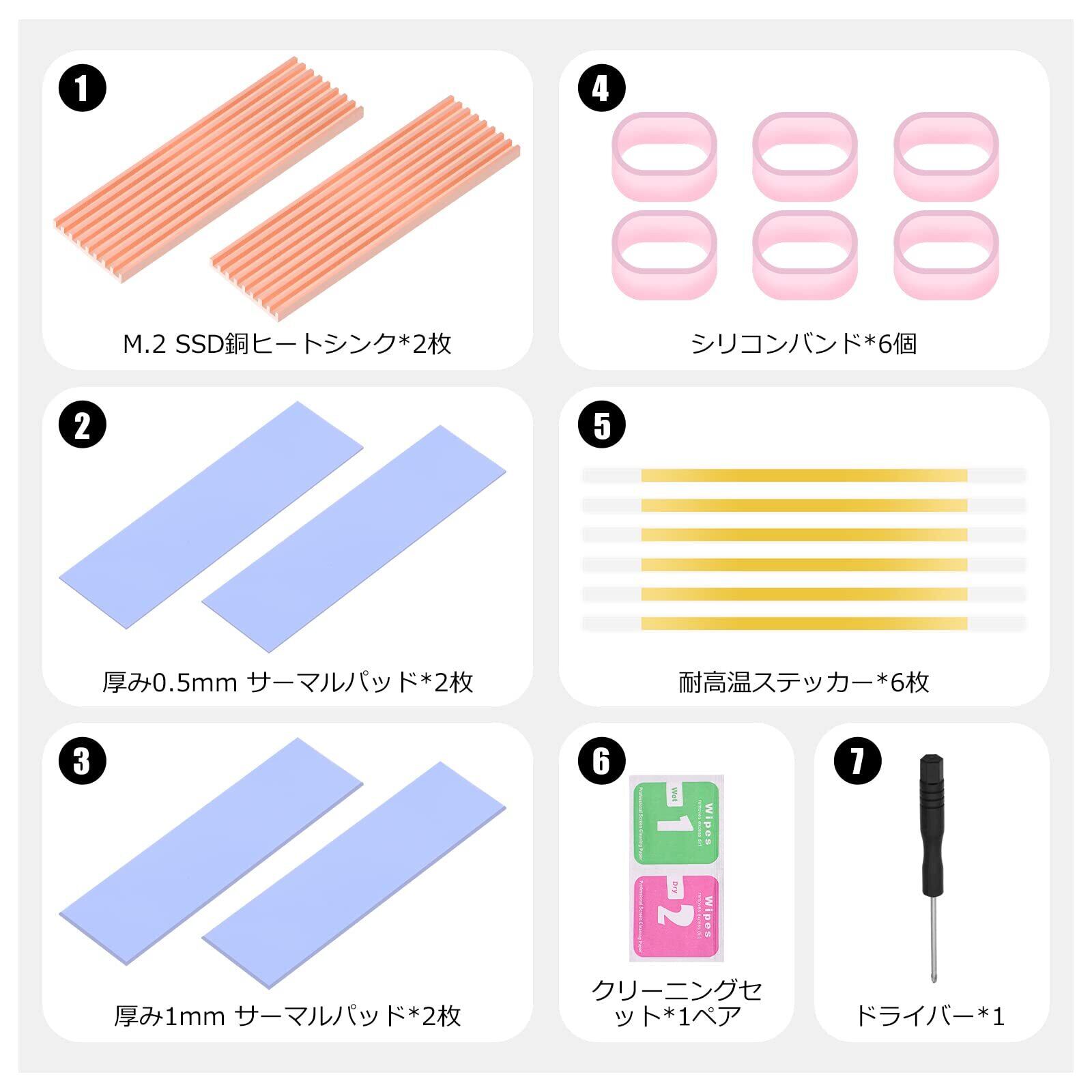 サーマルパッド付属:M.2 SSDとM.2 ヒートシンクの間に置かれ、低粘性、良い熱伝導率のサーマルパッド、厚み0.5mm / 1mmのを其々2pcs提供します。