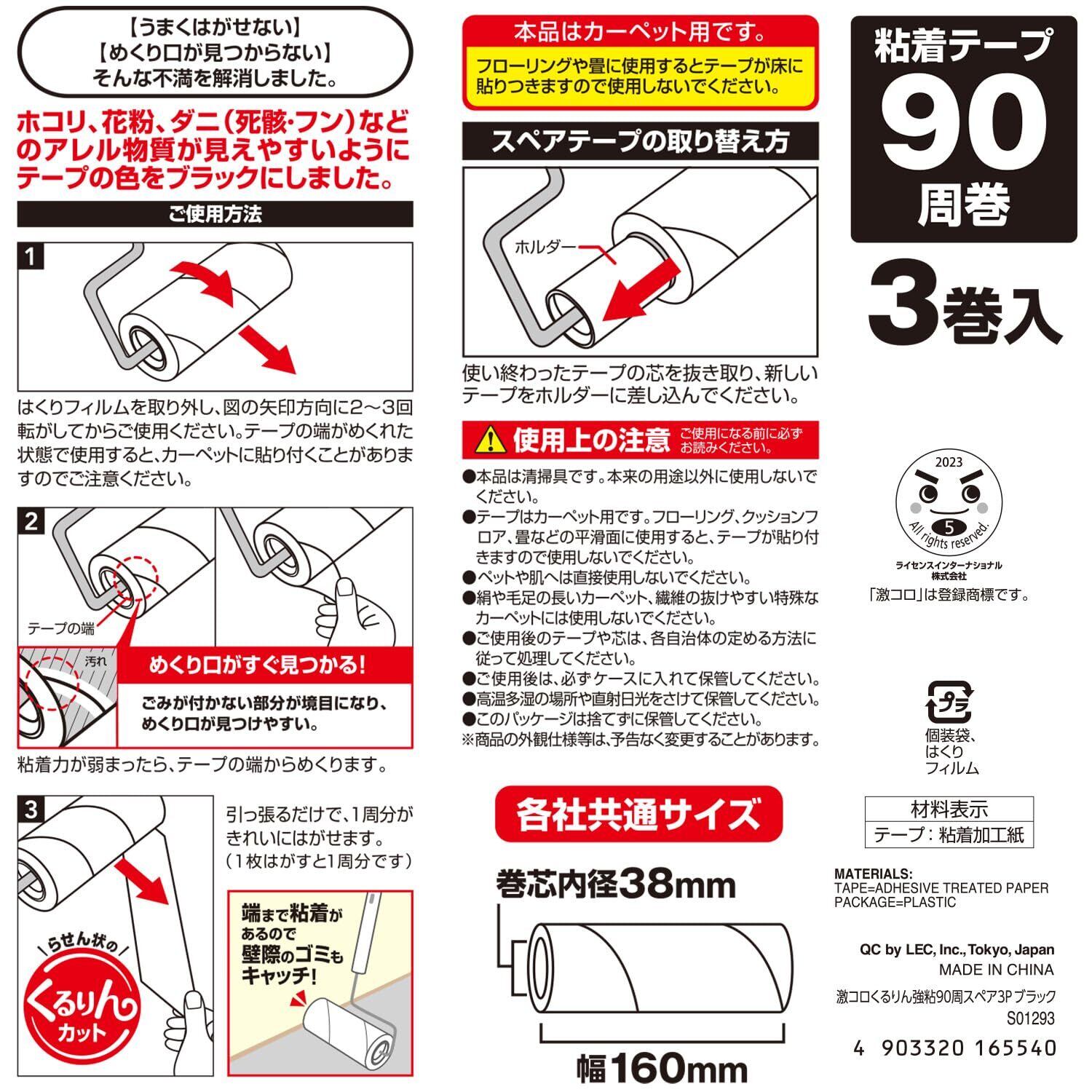 激コロくん らせん状 くるりん カット 強粘着 (90周巻 × 3本) アレル物質が見えやすいブラックテープ/サッとキレイにはがせます