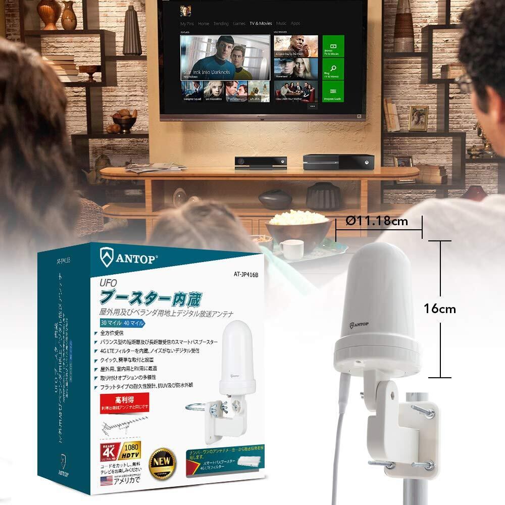 ANTOP 地上デジタルアンテナ 室外 HD テレビ 地デジ アンテナ TVアンテナ UFOアンテナ UHF対応 スマートパス増幅 360度全方位受信 5M同軸ケーブル付き 防水 抗UV 屋根裏用/RV用 設置簡単 AT-JP416B