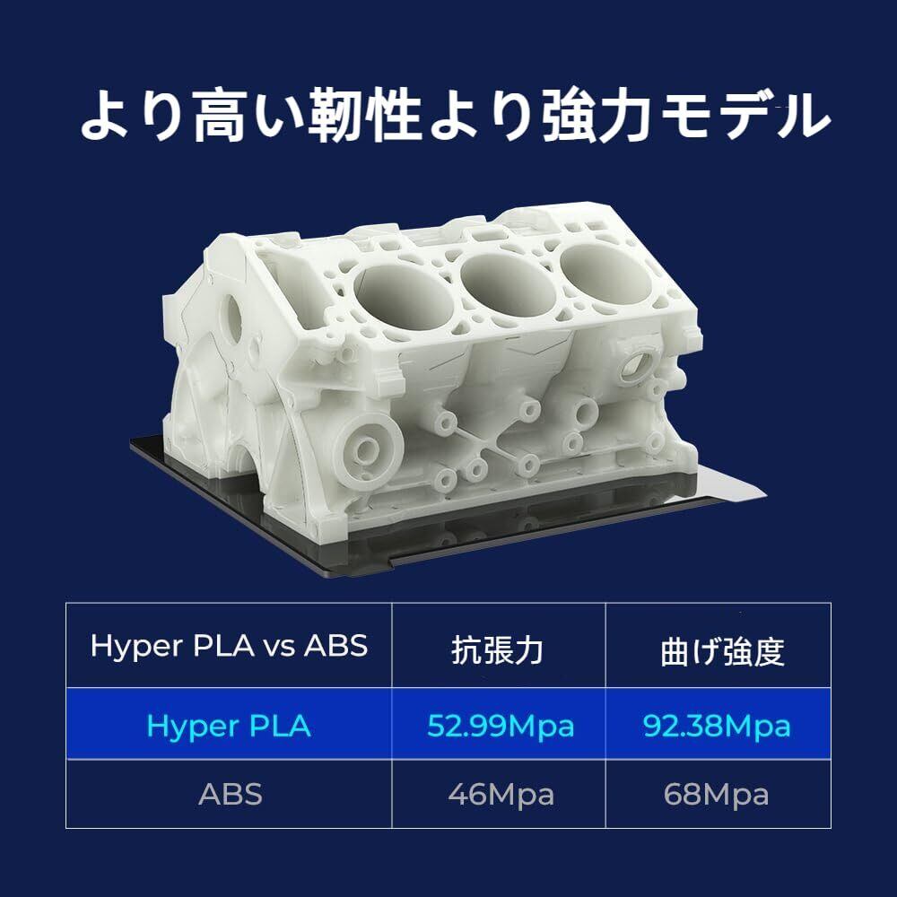 【急速冷却と成形】Hyper Series PLAフィラメントは、高い流動性と高速冷却のフォーミュラにより、最大600mm/s の印刷速度をサポートします。高い流動性により十分な溶融と押出が可能であり、急速冷却により高速印刷のための素早い成形が可能、K1 高速 3dプリンターなどにピッタリ相性があります。