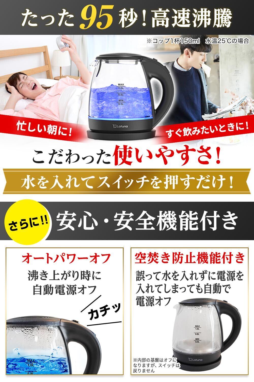 電気ケトル ガラス ケトル 湯沸かしケトル LEDライト付 電気 ポット 電子ケトル 【コップ1杯95秒】 1.0L [Latuna ラチュナ] コーヒー 湯沸かしポット 小型 おしゃれ 紅茶 お茶 空焚き防止 PSE認証済み (ブラック) | グランメゾンショップ