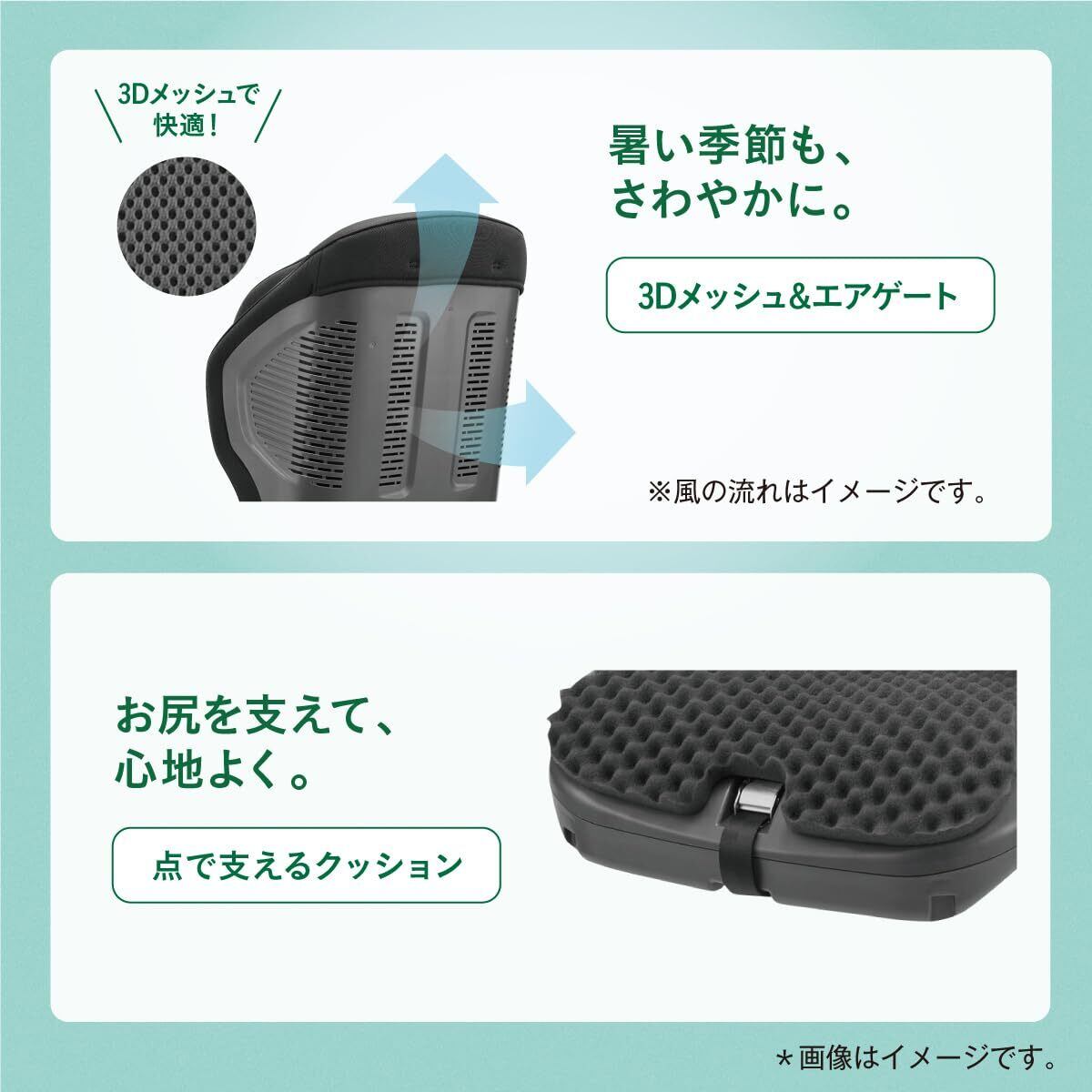 ●点で支えるクッション:座面には、立体形状の「点」で支えるクッションを採用。座り心地がよく快適が続きます。