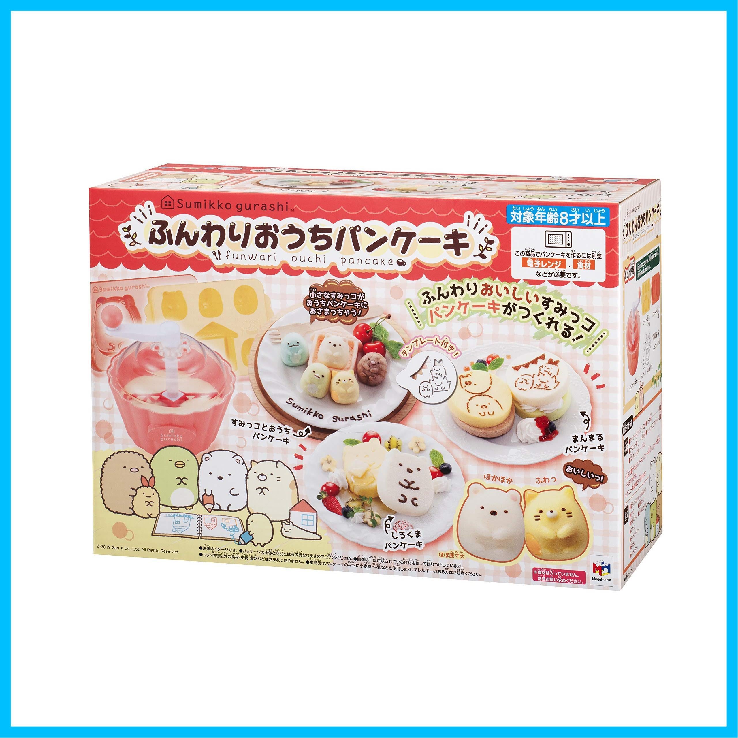すみっコぐらしのキャラクターのパンケーキが作れます! 大きなしろくまパンケーキや小さなすみっコのプチパンケーキなど! おうちパンケーキにすっぽり収められて、かわいく飾れます。 丸型パンケーキはテンプレートで絵を描けます。 【作り方】 ①ミックスボウルで材料をまぜる ②できた生地を型にながす ③電子レンジで加熱してできあがり! 【セット内容】ミックスボウル本体、テンプレート4枚、パンケーキ型(2種)、取扱説明書
