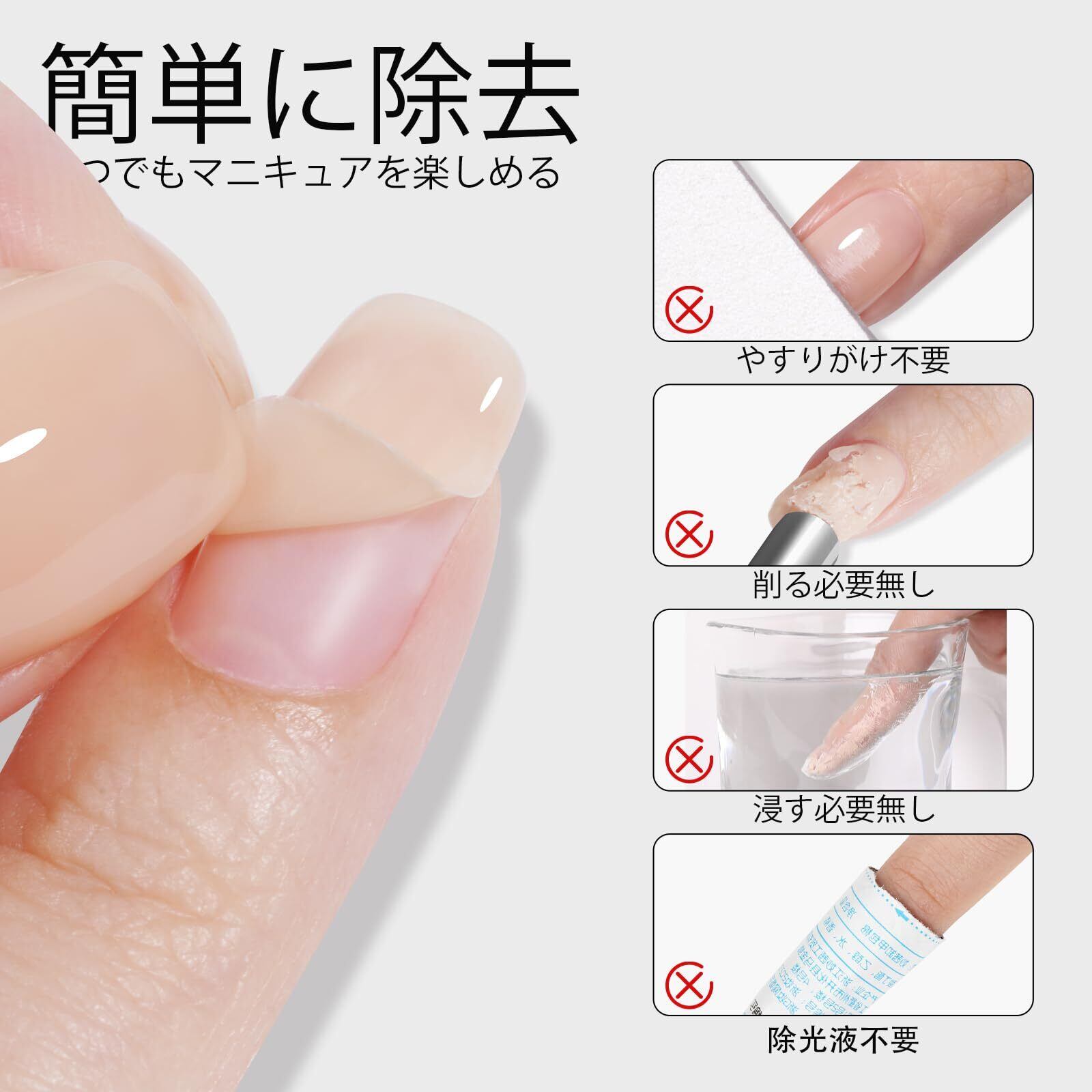 使いやすい:爪の表面をクリーニングします、剥がせるベースコートを塗っ、UV LEDネイルランプで60〜90秒で硬化します。剥がすときは、ピンセットを使ってジェルポリッシュの角をそっと持ち上げ、ゆっくりと剥がします。ジェルを剥がした後のベタつきがほとんど残らないので、綺麗にオフできます。