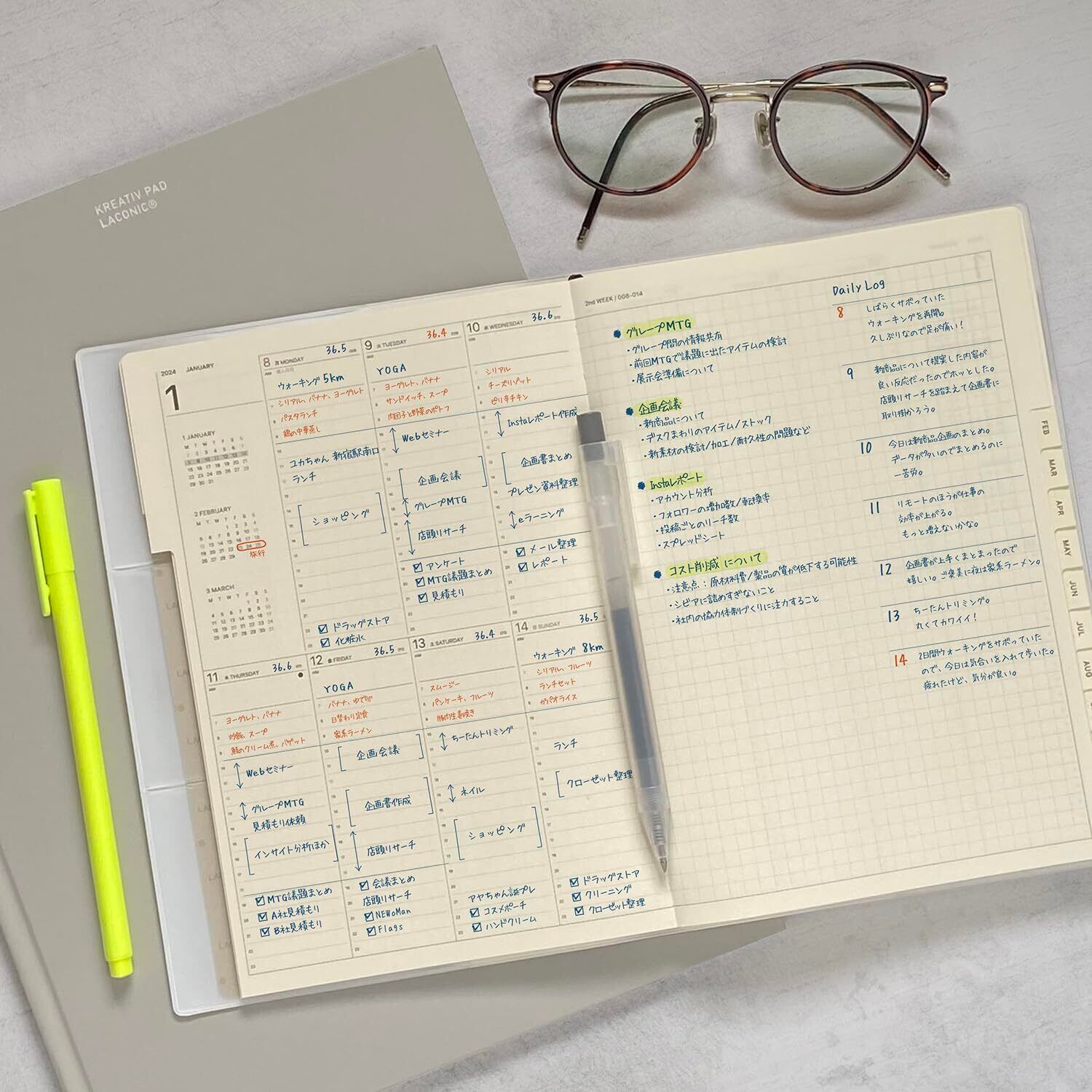 中身は左ページが1週間バーチカル(月曜始まり・土日均等割り)、右ページは記入自由度が高い方眼メモペースを採用。