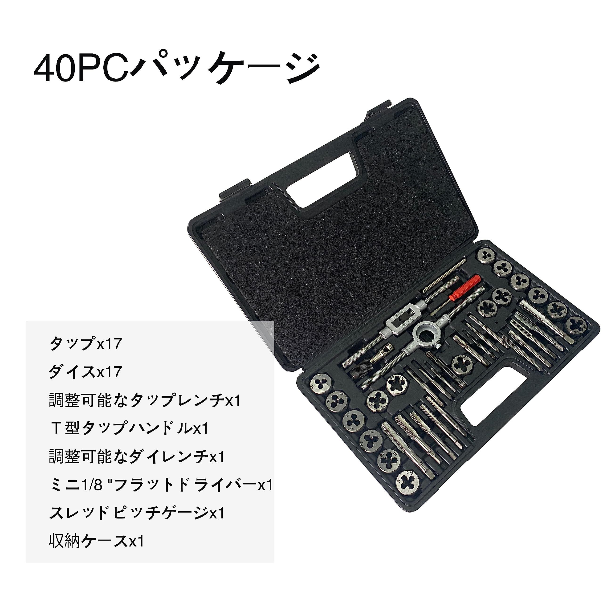 【40PCパッケージ】:タップx17、ダイスx17、調整可能なタップレンチx1、T型タップハンドルx1、調整可能なダイレンチx1、ミニ1/8 "フラットドライバーx1、スレッドピッチゲージx1、収納ケースx1。