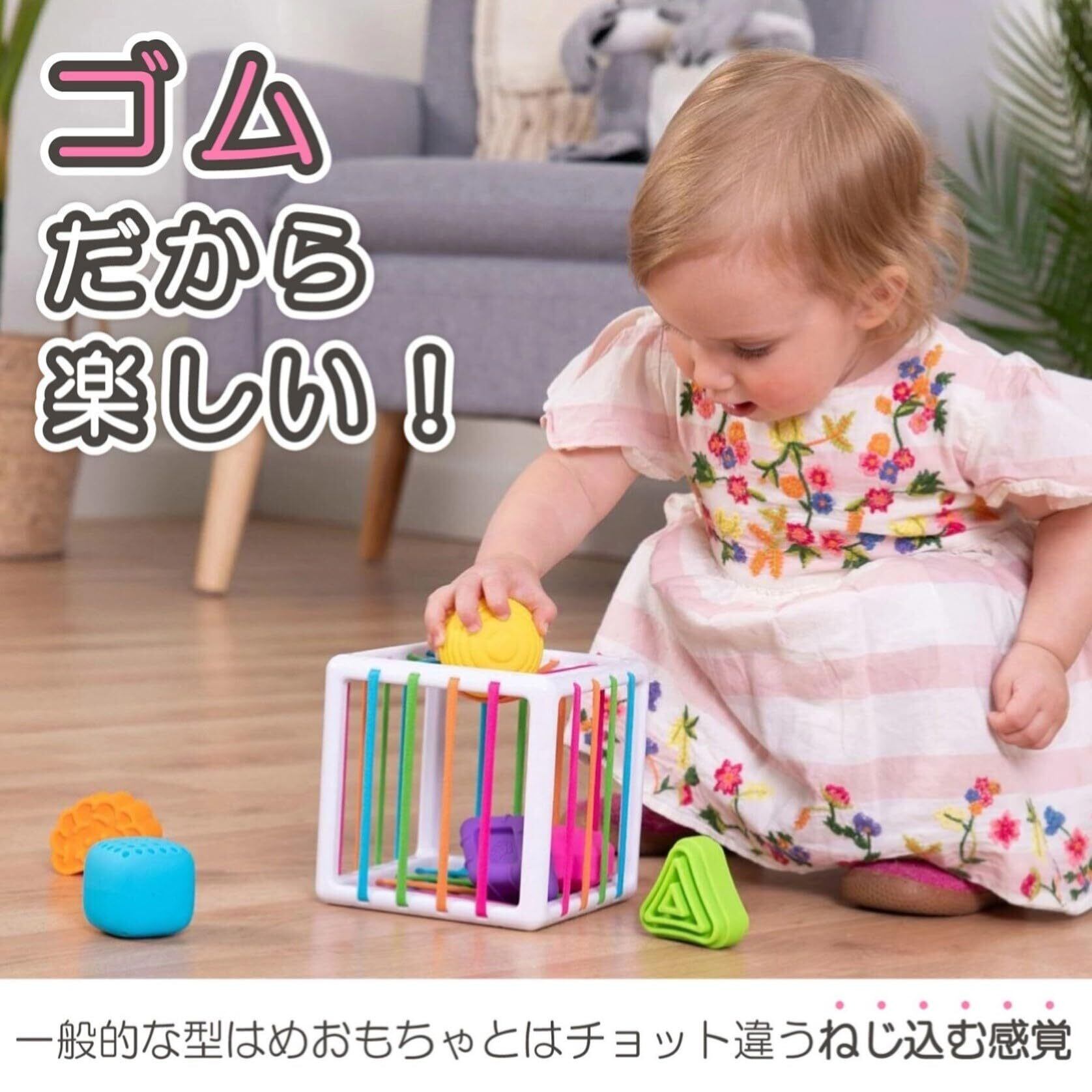 型あわせパズルのように色々な形をボックスの中に自由に入れましょう。ゴムを引っ張ったり押したり、指先知育にピッタリの赤ちゃんおもちゃです。