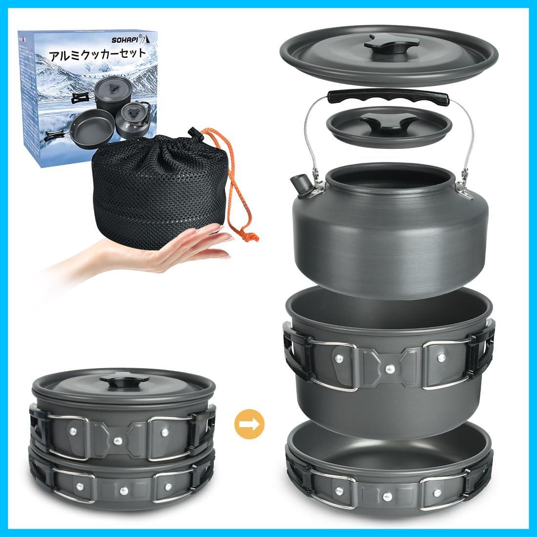 SOHAPI アルミクッカーセット キャンプ用品 鍋 アウトドアケトル クッカー くっかーセット アウトドア 調理器具 フライパン キャンピング鍋 収納袋付き 2–3人に適応 折畳み式 軽量 コンパクト(クッカーセット) | グランメゾンショップ
