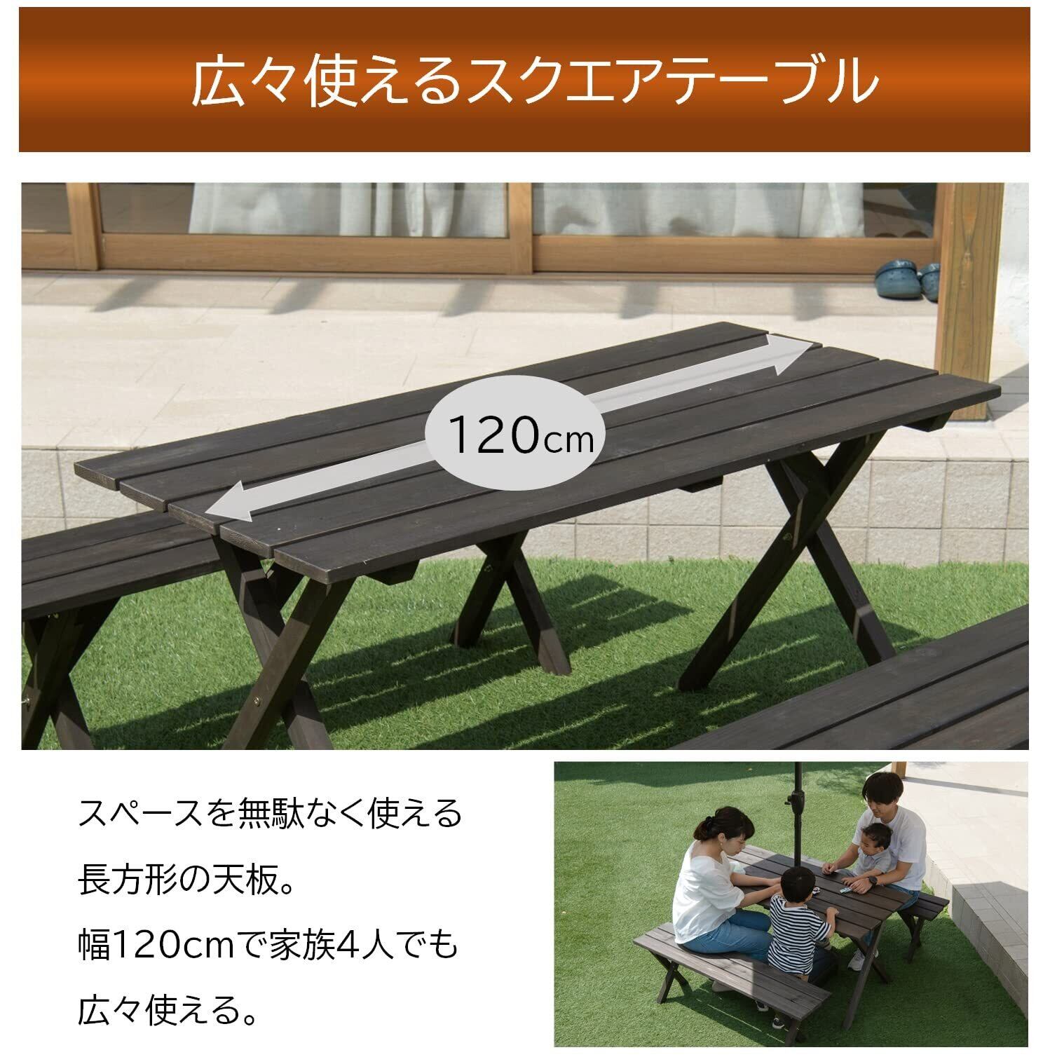 リビングアウト(Living Out) ガーデンテーブルベンチセット 木製 ダークブラウン テーブル/幅120×奥行59×高さ68cm、ベンチ/幅120×奥行28×高さ43cm 天然木 パラソル用ホール付 広々使えるスクエアテーブル ゆったり座れるベンチ 背もたれ無し