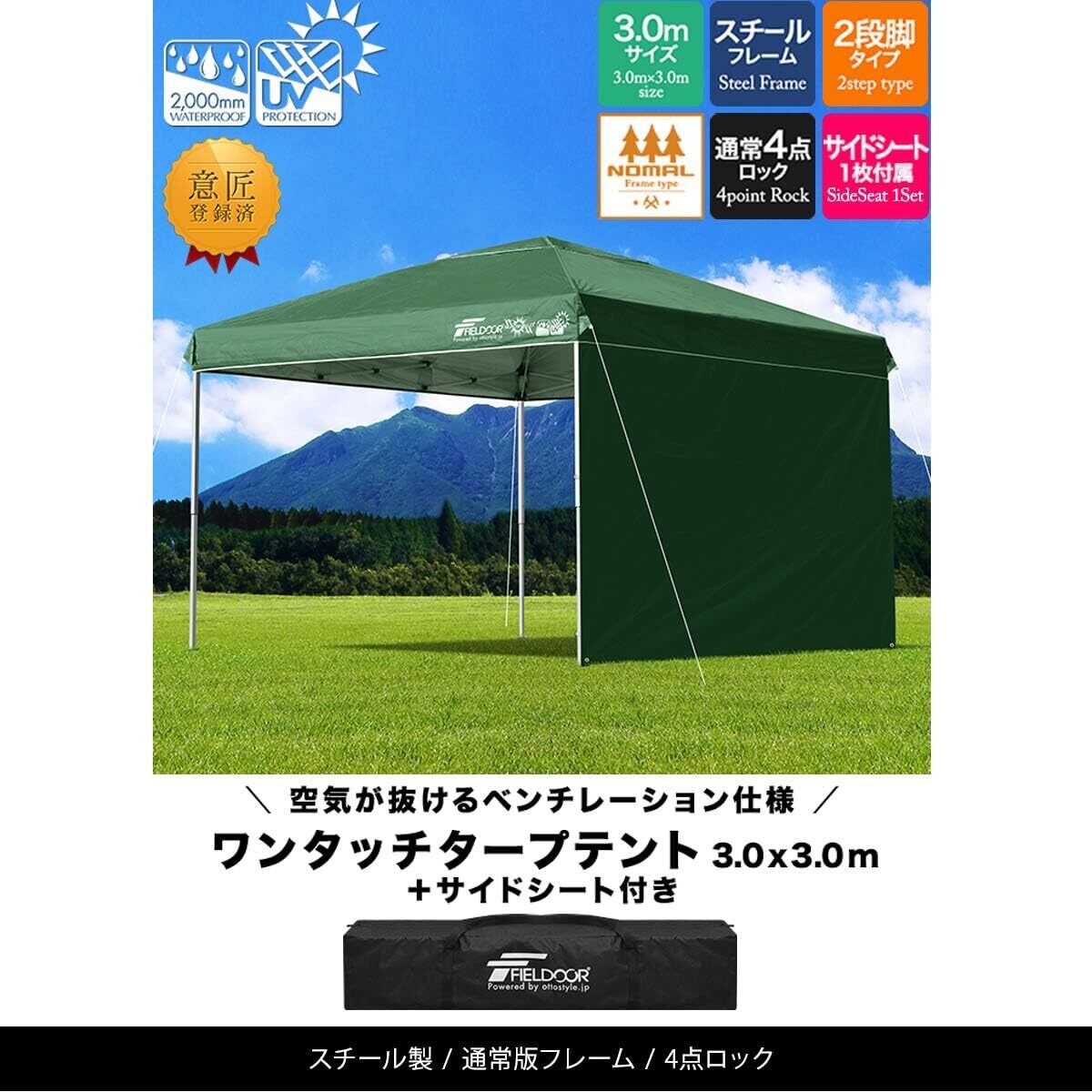 FIELDOOR 組立て簡単!! ワンタッチタープテント G03 スチールフレーム 専用横幕/サイドシート1枚付属 風抜けベンチレーション 高耐水加工&シルバーUVカットコーティング 紫外線カット 遮熱