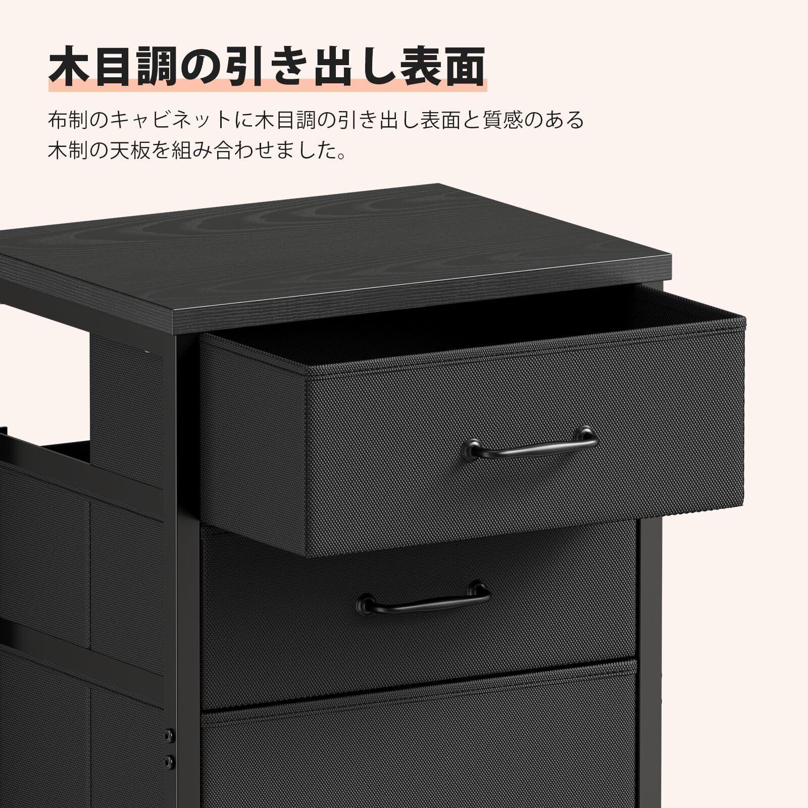 【温かみのあるデザイン】布制のキャビネットに金属のシンプルな取っ手と質感のある木制の天板を組み合わせました。シンプルなデザインと落ち着いた色合いで、単体の使用でも違和感なくインテリアになじみます。オフィスや寝室、リビングなど、さまざまな場所で使用できます。