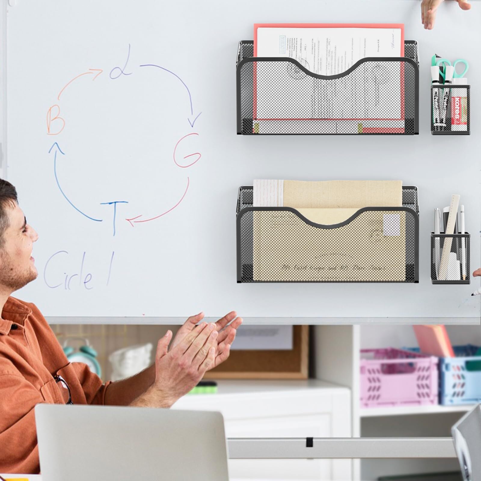マグネット式 壁掛け収納書類 強力な磁気で A4サイズのファイルを2枚掛けられるファイルホルダー 2つのペン立てダーが付属しており デスク周りのファイル収納 オフィスや教室でホワイトボード収納用 (ブラック)