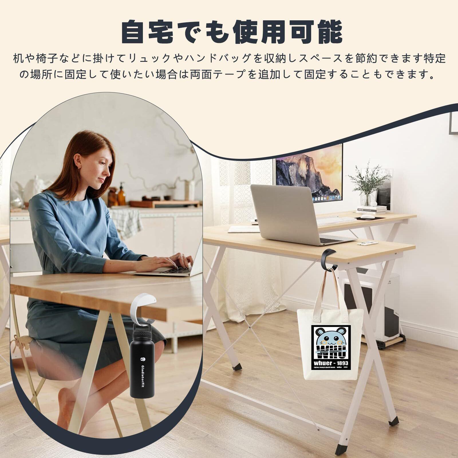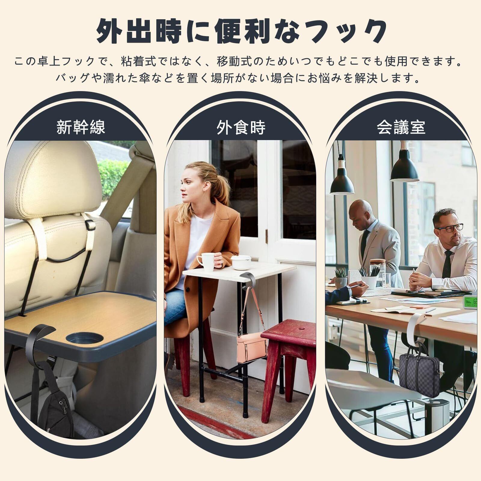 【幅広い用途】このテーブルフックは自宅でも外出先でも利用可能。バッグハンガーとして、鞄や傘、イヤホンなどの掛けることができ、オフィスデスクや本棚、キッチンの戸棚下など、多彩な場所で役立ちます。軽量で持ち運びが容易なため、新幹線や外出先、図書館などでも利用でき、キッチンツールやヘッドセットの収納にも最適。プレゼントとしても好評です。