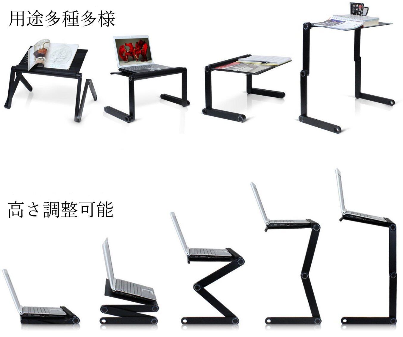 【軽量コンパクト】本体の材質はアルミ合金製(ジョイント部、サイドテーブルはABS樹脂) 軽量かつ耐久性能抜群 持ち運びも楽々。ノートパソコン 不使用時コンパクトサイズのためわずかなスペースで簡単収納。
