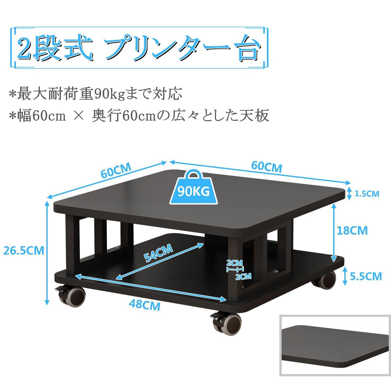 CYUUEU プリンター台 プリンターラック 幅60cm 奥行60cm 2段 大型プリンター対応 キャスター付き プリンター置き 台 収納棚 机下収納 木製ラック プリンターワゴン カート 90kg総耐荷重 オフィス 家庭用 コピー機台 (ブラック) | グランメゾンショップ