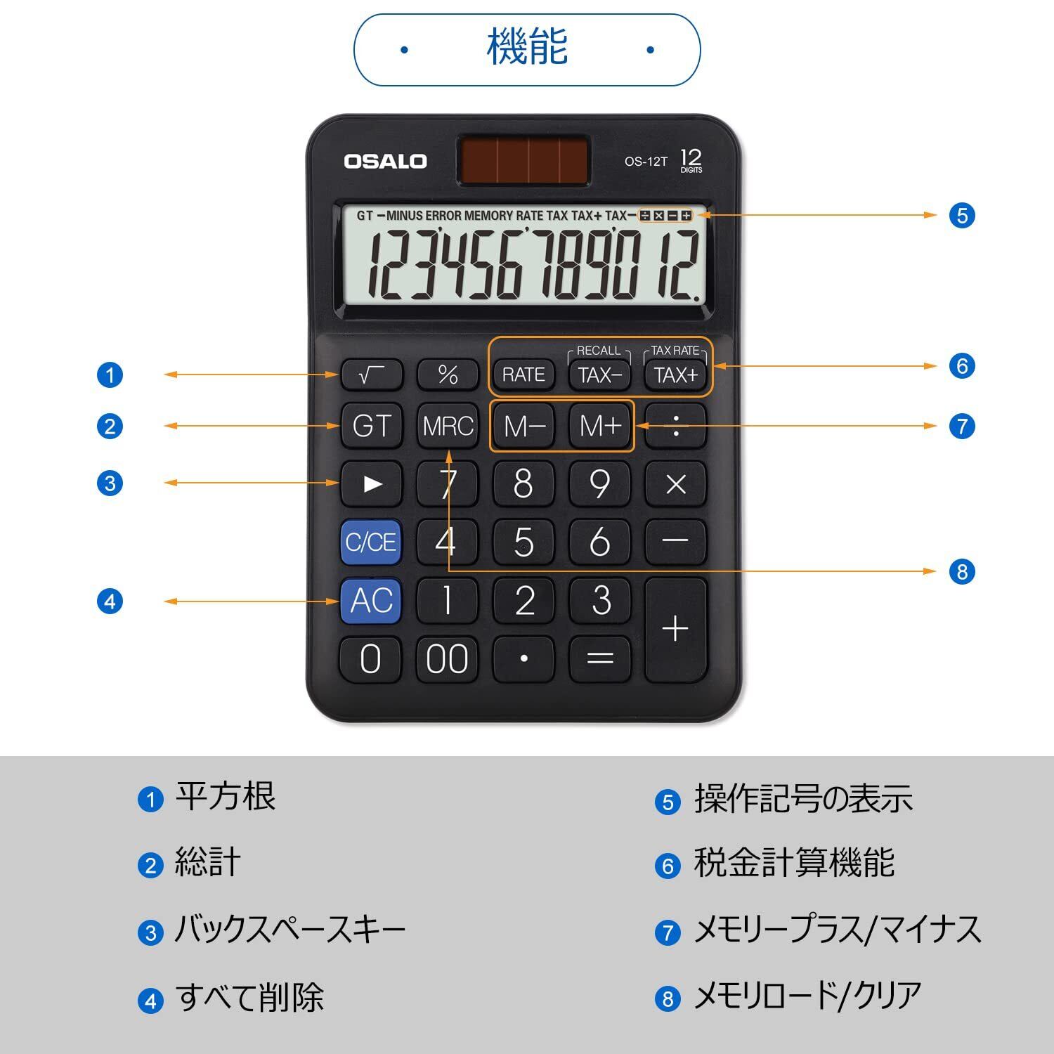 卓上電卓 大型LCDディスプレイ 12桁 数字ビッグボタン 税金会計計算機 電池式 太陽光発電 デスク オフィス 自宅 ビジネス用 (OS-12T 黒)