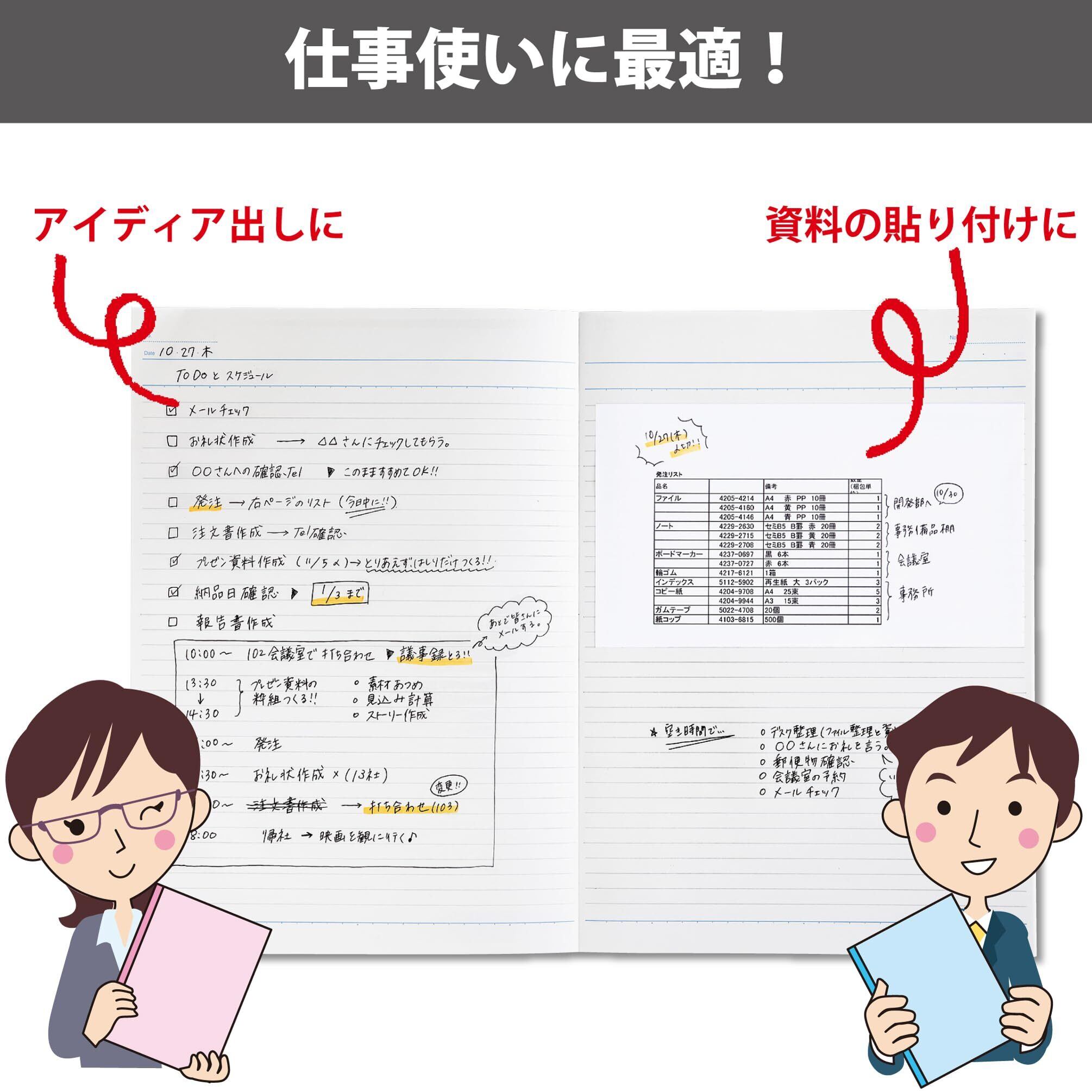 ●A4サイズの大きなノートなので、B5サイズの資料やプリントを切らずにそのまま貼り付けることができ、保管しやすくなっています。