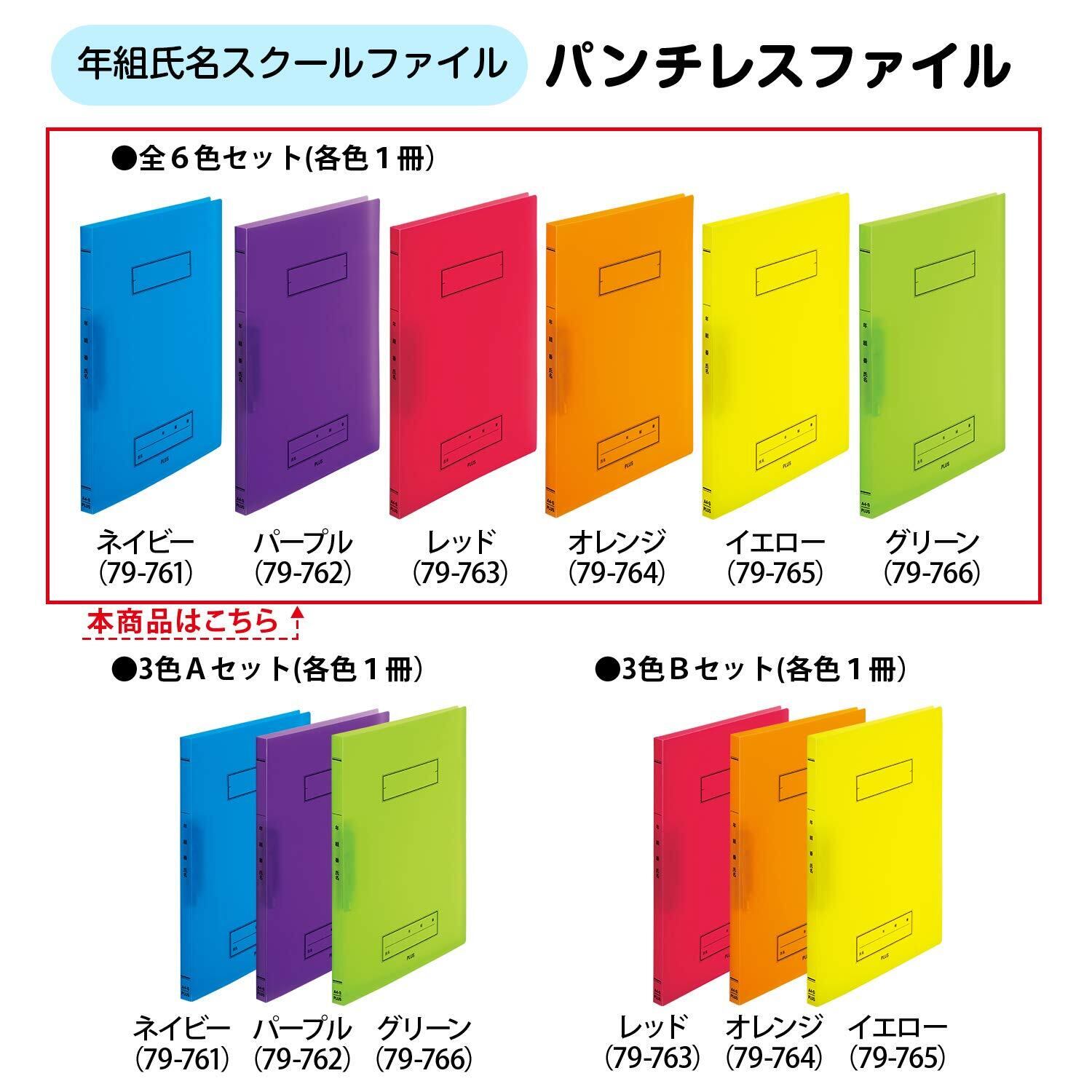 プラス 年組氏名 スクール パンチレスファイル A4 Z式 ネイビー・パープル・レッド・オレンジ・イエロー・グリーン 6冊入 全色セット (6色入・各色1冊)