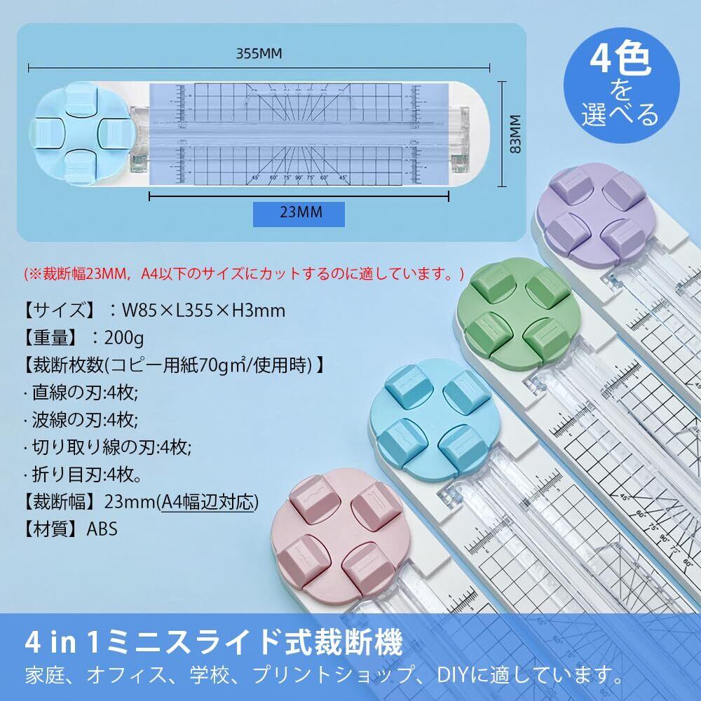 4 in 1ミニスライド式裁断機 【パッケージ内容】:スライダー式ペーパーカッター×1個 【色】:4色を選べる(ピンク、ブルー、パープル、グリーン) 【サイズ】:W85×L355×H3mm 【重量】:200g 【裁断枚数(コピー用紙70g㎡/使用時) 】直線の刃:4枚;波線の刃:4枚;切り取り線の刃:4枚;折り目刃:4枚。【裁断幅】23mm(A4幅辺対応)【材質】ABS