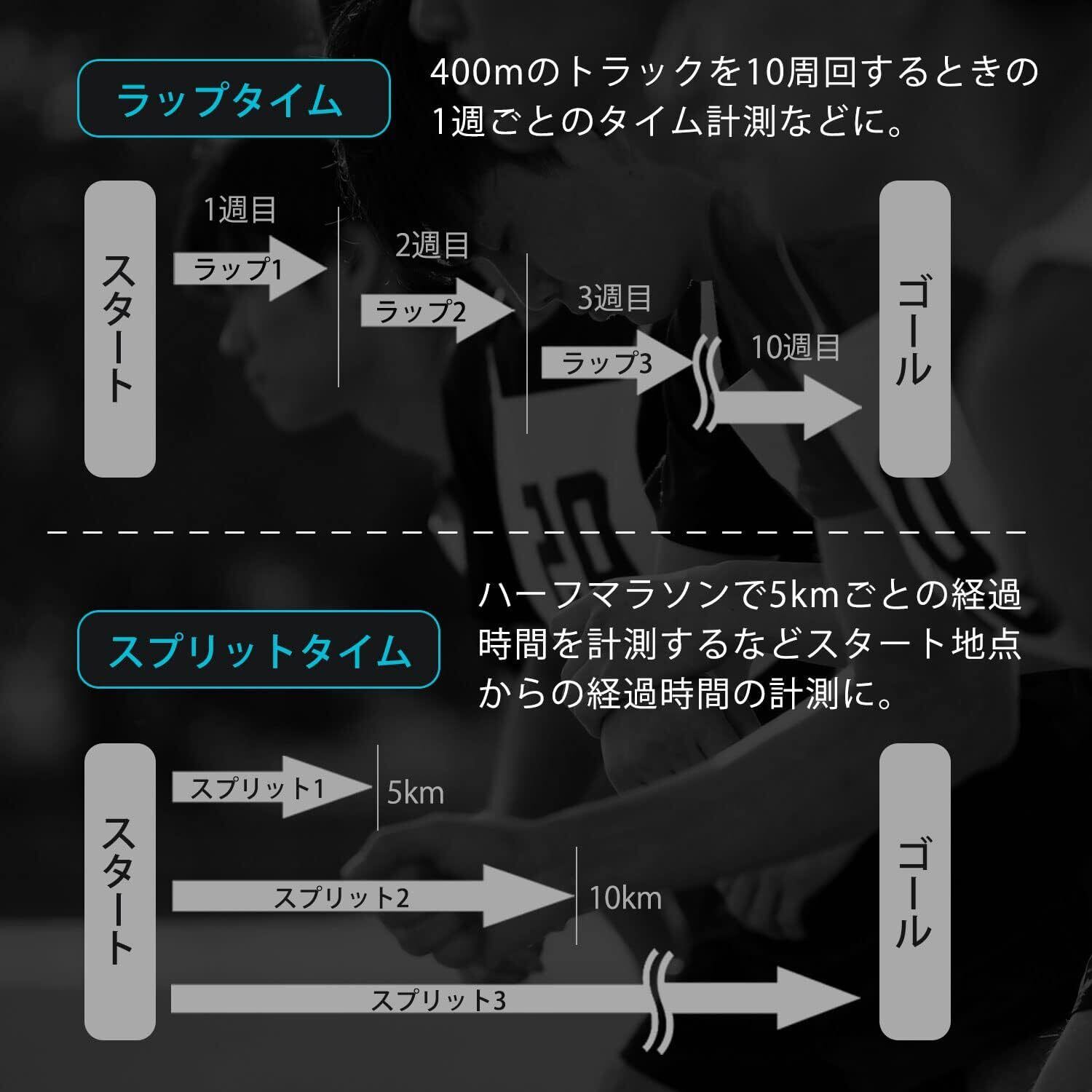 ・スポーツでの使用に適した1/100秒計測やスプリットタイム計測、ラップタイム計測が可能です。ラップタイムとスプリットタイムは100個まで記録を保存することが可能です。(100メモリー)