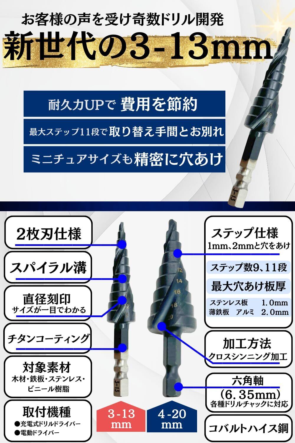 【製品仕様】:3-13mmの奇数ドリル(11段)3,4,5,6,7,8,9,10,11,12,13mm 、4-20mmの偶数ドリル(9段)4,6,8,10,12,14,16,18,20mm