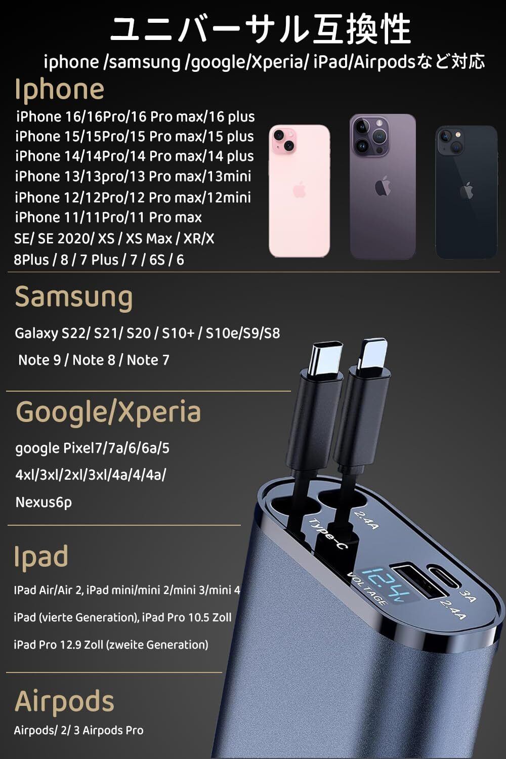 多様な機種に対応:この車載充電器はQC3.0とPD対応で、付属のType-Cケーブルは最大合計100W/66Wの急速充電が可能です。Lightningケーブルも最大合計20Wで急速充電に対応しています。iPhone、Xperia、Galaxy、Ultra、iPad,AQUOSなど、様々なスマートフォンやタブレットに対応しています。