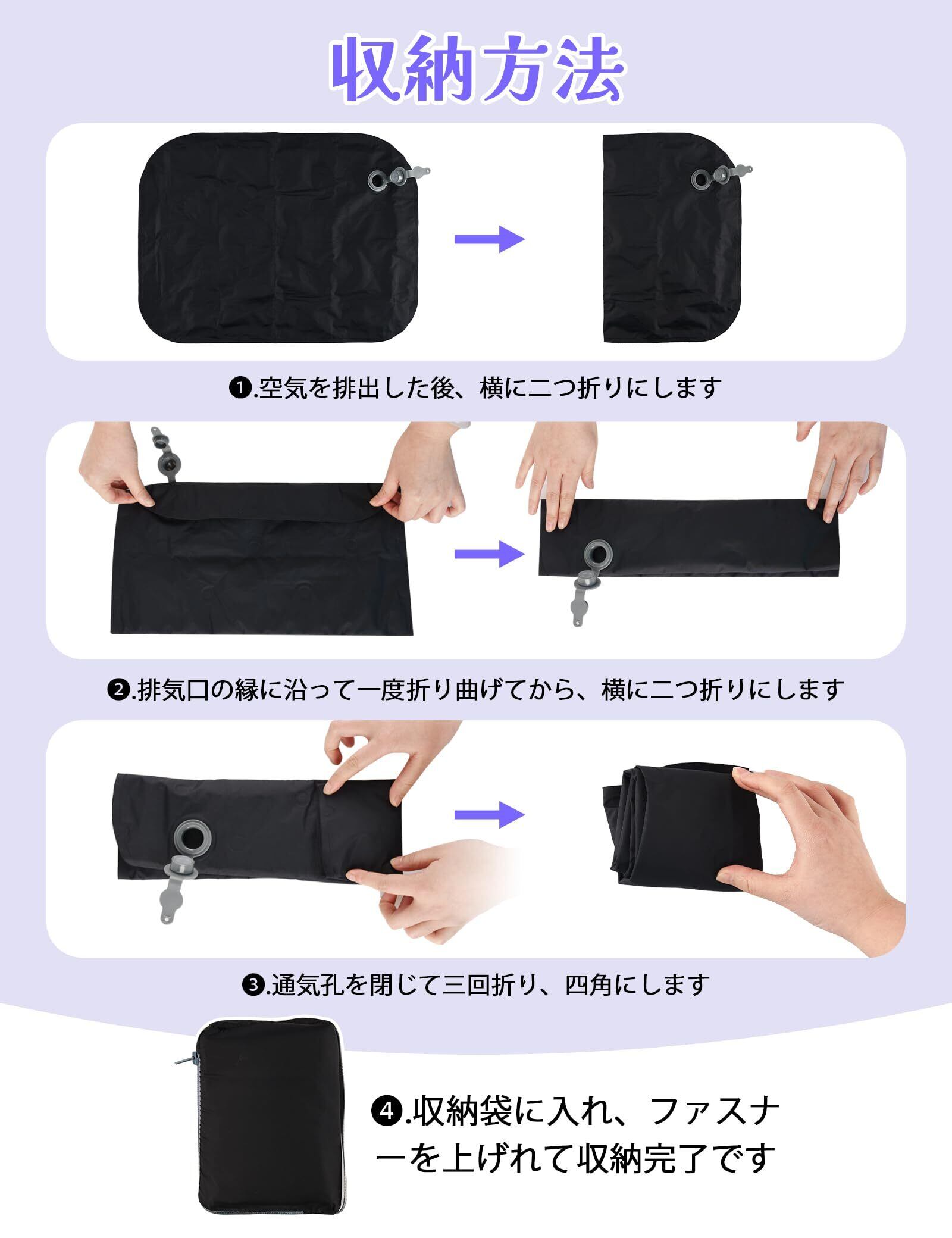 「素早い膨らむと排気」当社の折り畳み座布団は使いやすく、女性、子供、お年寄りのかたでも簡単に完成できます。折り畳みクッションのボタンを開けて3〜5秒間空気を吹き込むだけで簡単に膨らますことが可能。空気を抜くときは、開口ボタンを引くと簡単に空気が排出できます。